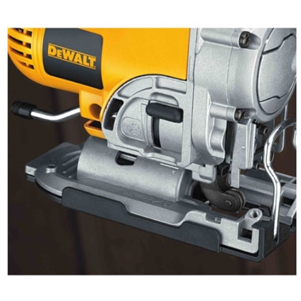 The DC330K jig saw kit has an all metal, lever-action keyless blade clamp designed for quick and easy blade changes and an all-metal keyless shoe bevel with four detents at 0, 15, 30 and 45 deg to make bevel adjustments easy. The variable speed trigger provides up to 3000 spm to easily adjust speeds during cutting and 4-position orbital action for wood cutting. A removable shoe cover helps protect materials from scratches and the dust blower helps users see where they're cutting.