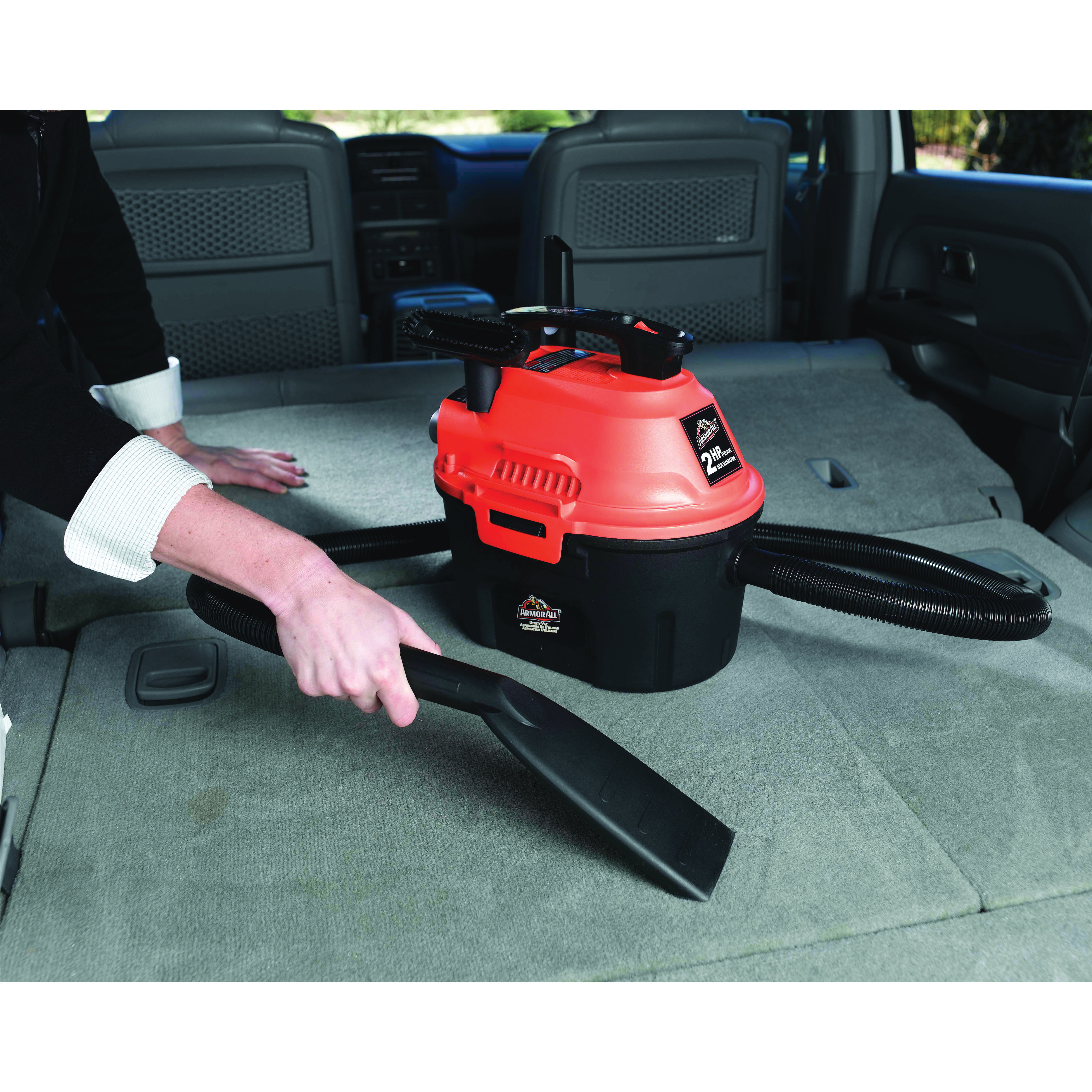 This portable Armor All utility VAC is specifically designed to clean the interior of your car and handles both wet and dry pickup. Includes all accessories for complete interior cleaning and easily converts to a blower to dry motorcycles, car grills and wheels. It also has an auto-matic shut-off to prevent overflow and a built-in air and noise diffuser for efficient and quiet operation. It also features a 10 ft power cord with cord wrap, on-board accessory, hose storage and a dust sealed switch. It includes a 6 ft x 1-1/4 in hose, reusable foam filter sleeve, 2-in-1 utility nozzle, crevice tool, blower nozzle/adapter, deluxe car nozzle and a car detail brush.