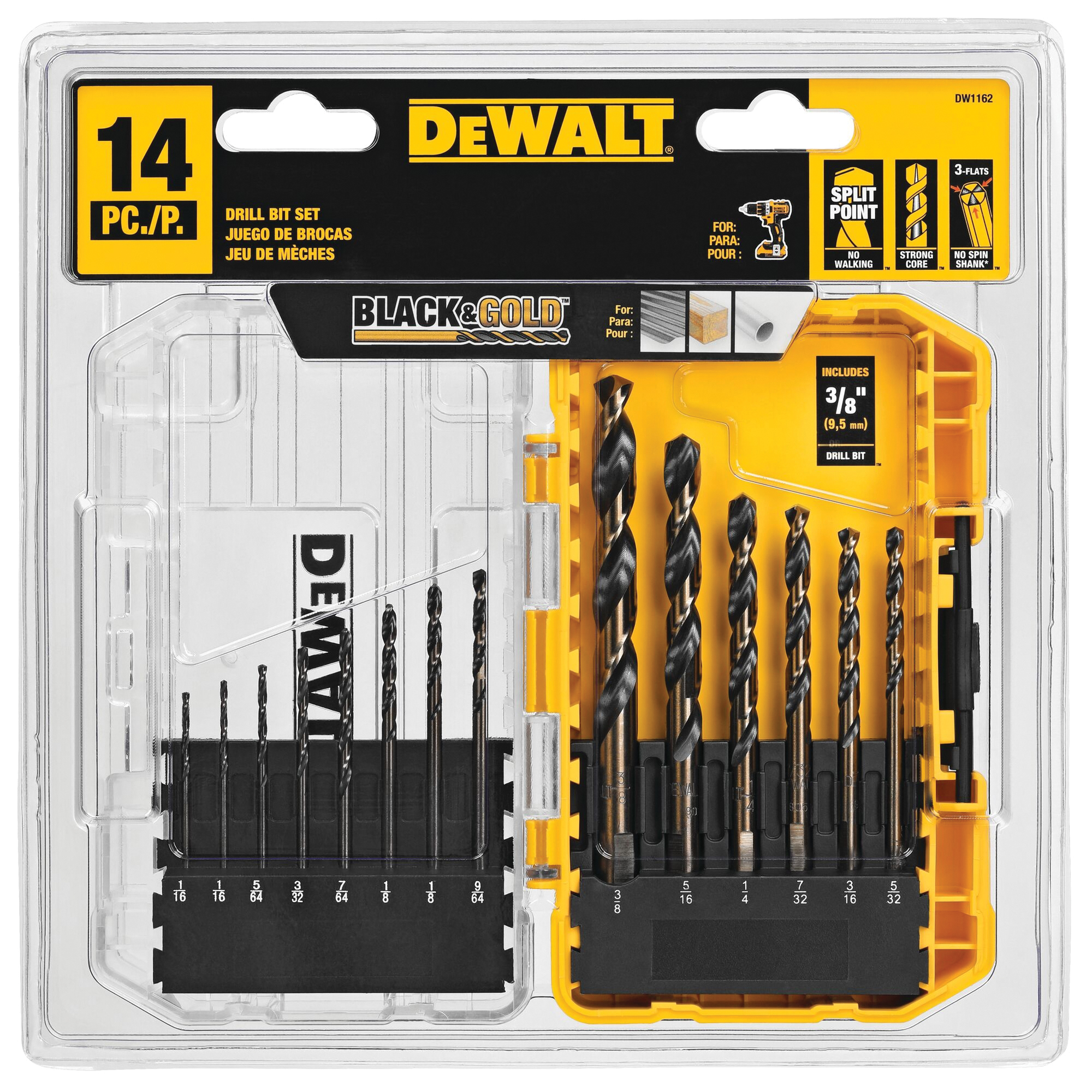 135 deg split point design reduces slip and walking and allows for easier no-slip starting. No spin shanks. Black oxide finish for greater wear protection. Parabolic flute design for greater bit strength. Includes touch case container to keep bits organized. Sliding soft grip lock keeps case closed securely. These bits are ideal for drilling in metal, wood and plastics. Set contains bits ranging from 1/16 to 1/4 in.