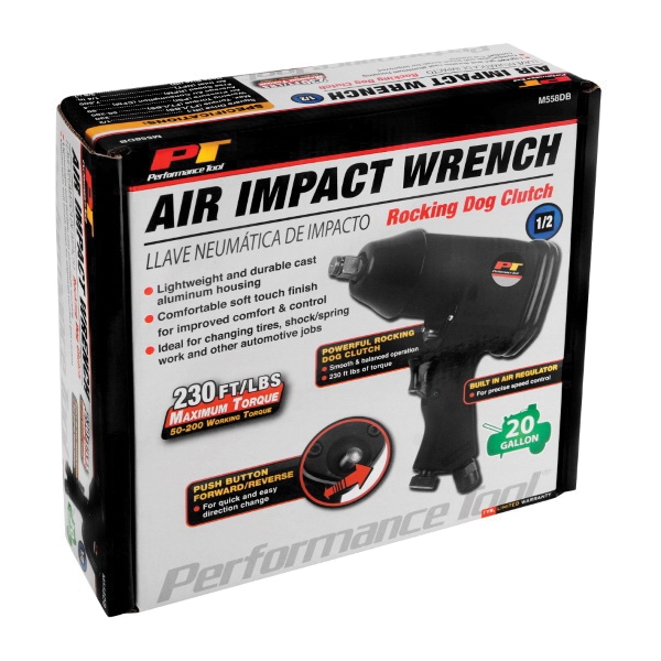 Performance Tool Impact Wrench, 1/4 in Air Inlet, Drive Size: 1/2 in, 7500 rpm, Torque Rating: 550 ft-lb, Control Type: Pushbutton, Housing Material: Aluminum