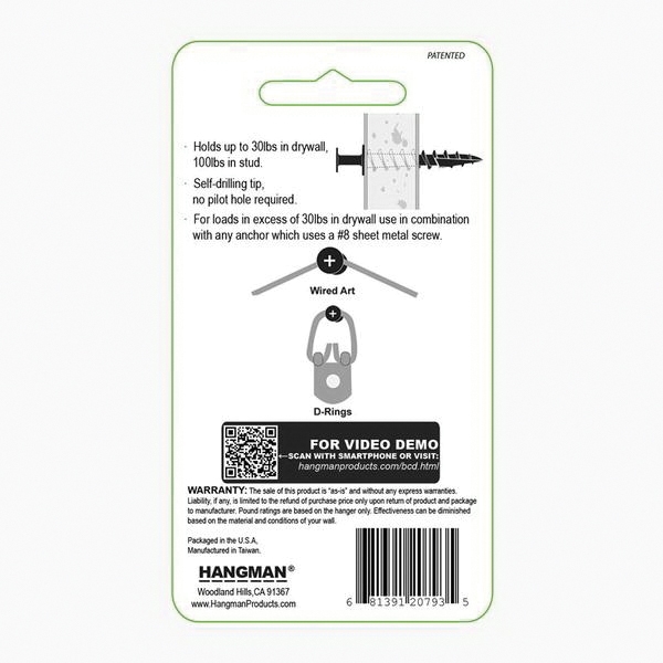 The Hangman black bear claw hangers includes the BCD double-headed, anchorless screw which works best with D-rings or wire for simple mirror and picture hanging solutions. Installs with a hand-held Phillips screwdriver. No pilot hole required because it has a self-drilling tip for easy installation.