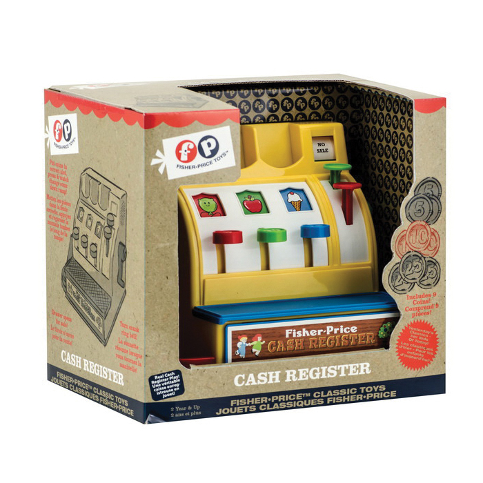 Inspired by the 1975 Fisher Price™ cash register that was an instant classic toy hit. Comes with different colored coins that teach children how to count and recognize colors. Watch the coins roll down the ramp, turn the crank to hear the bell ring and watch the drawer open.
