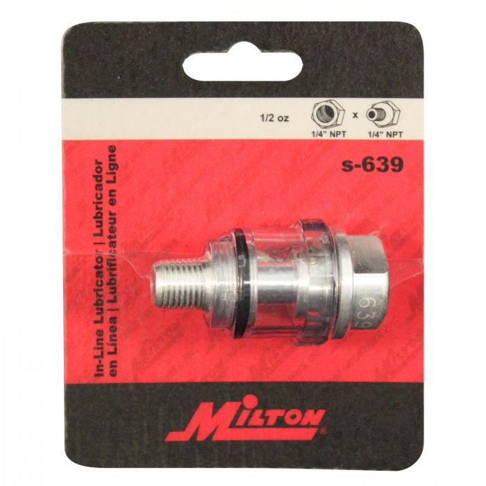 In-line lubricator with 1/4 in MNPT x 1/4 in FNPT to lubricate pneumatic tools for full protection. Accurately meters correct amount of oil. MILTON oil #1001 recommended. In-line lubricator is great for when you don't have access to full FRL system. 1/2 oz oil capacity.