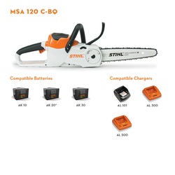 The MSA 120 C-B is your new go-to chainsaw for storm clean-up or limb removal around your property. It is lightweight at only 8.4 lb. (including battery, bar and chain) and features low vibration, quick chain adjustment and Stihl® QuickStop® Plus chain braking feature. It also comes with the exclusive 1/4 in Stihl® PICCO™ saw chain custom designed for use on Stihl® battery-powered chainsaws. On 4 in Dia wood, this Stihl® AK Series chainsaw can make 100 cuts on a single charge, which gives you enough power to tackle a tall stack of firewood. Add this battery-powered chainsaw to your garage today. The actual listed guide bar length can vary from the effective cutting length based on which powerhead it is installed on. Usage claim tested and verified by an independent third-party test laboratory. Runtime may vary based on battery type, charge level and capacity, model, operating style and conditions. Batteries and chargers can be purchased separately or as a combined set with tool.