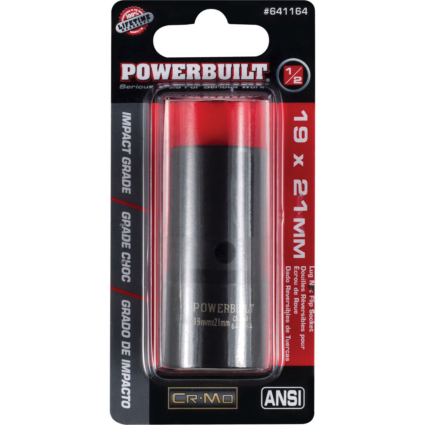 Talk about versatile! This stylish 1/2 in drive impact flip socket fits 19 mm and 21 mm lug nuts. Built of strong premium chromoly steel with a beautiful stealth black phosphate finish, theses sockets have thick walls that pass torque wind-up from the impact tool to the fastener with maximum power and minimum drama. The high contrast size markings won't wear off so finding the right socket end is easy. Inside, our innovative Z-Drive design helps sockets get a better grip by turning fasteners by their sides, not their corners, giving you more control and reducing slippage at hig-torque loads. Precision chamfered openings make it easier to slide the sockets over fasteners. Dependable Powerbuilt sockets meet or exceed ANSI standards and have a lifetime warranty, all at affordable prices.