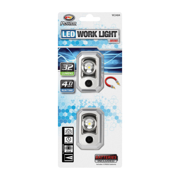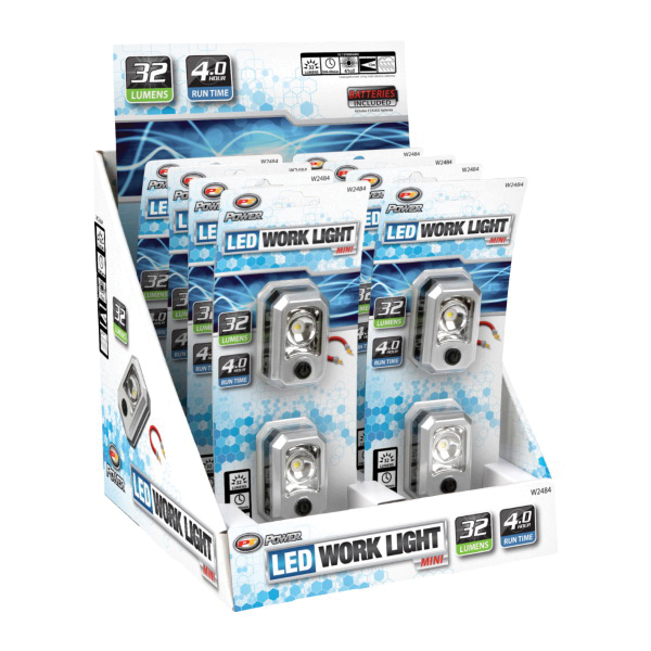 Performance Tool Mini Work Light, Battery Type: Button Cell, Number of Batteries: 2, Lamp Type: LED, Lumens: 32 Lumens, Includes: (2) CR2032 Button Cells