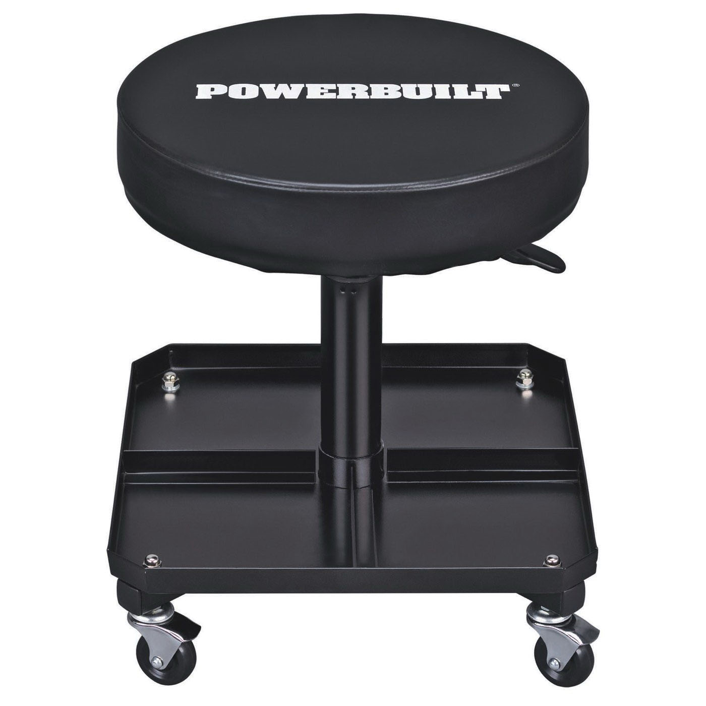 Have you ever sat down to work on your car and realized too late that you left the tools you need on the workbench. Well, now you can keep your tools right under your seat with the dependable professional pneumatic roller seat. Imagine sitting down on the stylish padded seat and having everything you need right within reach in the strong metal tray beneath you. Stool too high. With one hand, you can adjust the seat height from 18 to 22-5/8 in. The heavy-duty precision 2-1/2 in swivel casters roll without a hitch, letting you maneuver with ease. Powerbuilt roller seats. Innovative, affordable and built to last.