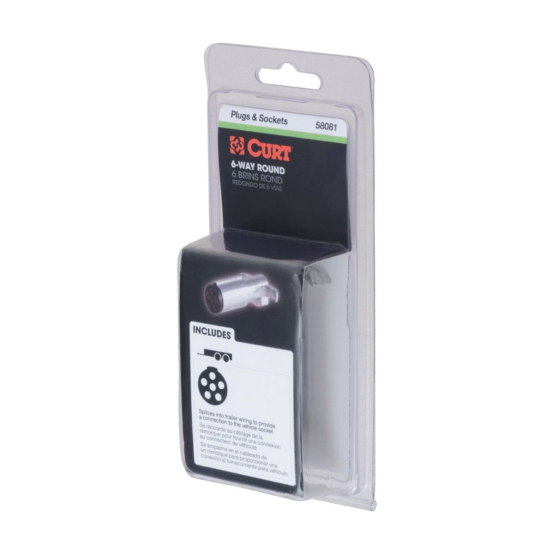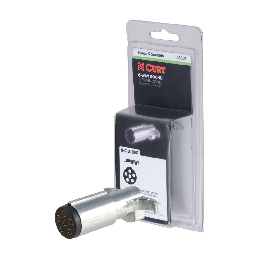 Like trailer hitches and ball mounts, electrical connectors range all over the board in shape, size and capability, but no matter what your trailer's electrical functions are, you need a solid connection to keep the power flowing and ensure safety on the road. Curt electrical connectors are designed and manufactured to give you a reliable connection every time you plug in your trailer. This six way round connector is designed to supply power for tail lights, turn signals, electric trailer brakes, a 12 V battery and brake lights, as well as a ground connection. It features durable die cast metal construction and is a male end plug, specifically designed for the trailer side of the connection. Six way round connectors are commonly used on livestock trailers, boat trailers and utility trailers.
