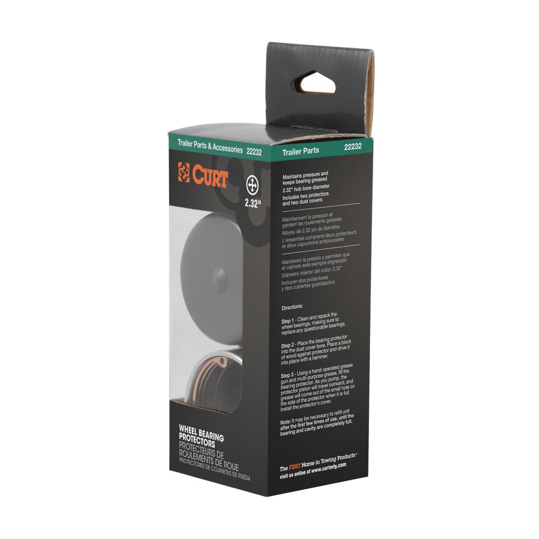 Keeping the wheels of your trailer well lubricated is an important part of towing responsibly. It may not be on the forefront of your mind, but a trailer's wheels need to be cared for just like the wheels of your vehicle. Curt offers an easy way to give your trailer wheels proper care to help maximize the life and performance of your trailer. Acting like a cap for your wheel bearings, Curt bearing protectors offer two essential benefits for your trailer. First, they provide a reservoir of grease to lubricate your wheels and keep them turning smoothly mile after mile. Second, they cover the bearings so that mud, rain, road grime and other threats to their function are kept out. A bad wheel bearing can start out as a mere annoyance, but before long, it can turn into a huge problem. With Curt wheel bearing protectors, you can ensure that your wheels keep turning, quiet as a mouse. Our bearing protectors also come with plastic dust covers that fit over the end of the protector for even more defense against the elements. Choose a set of Curt bearing protectors for your trailer wheels and get the most out of your towing. This set of bearing protectors features a 2.32 in hub diameter.
