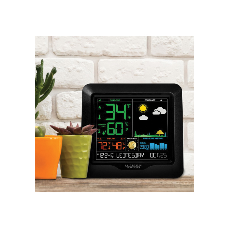 La Crosse Forecast Station, Humidity Range: 10 to 99 %, Wireless Range: 300 ft, Atomic Clock/Calendar: Atomic Clock, Calendar, Power Source: Battery, Dimensions: 6.4 x 6.89 in
