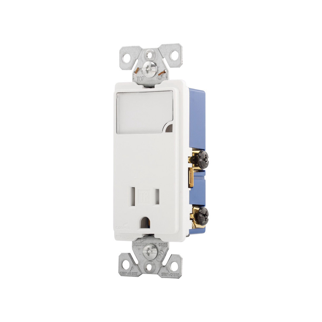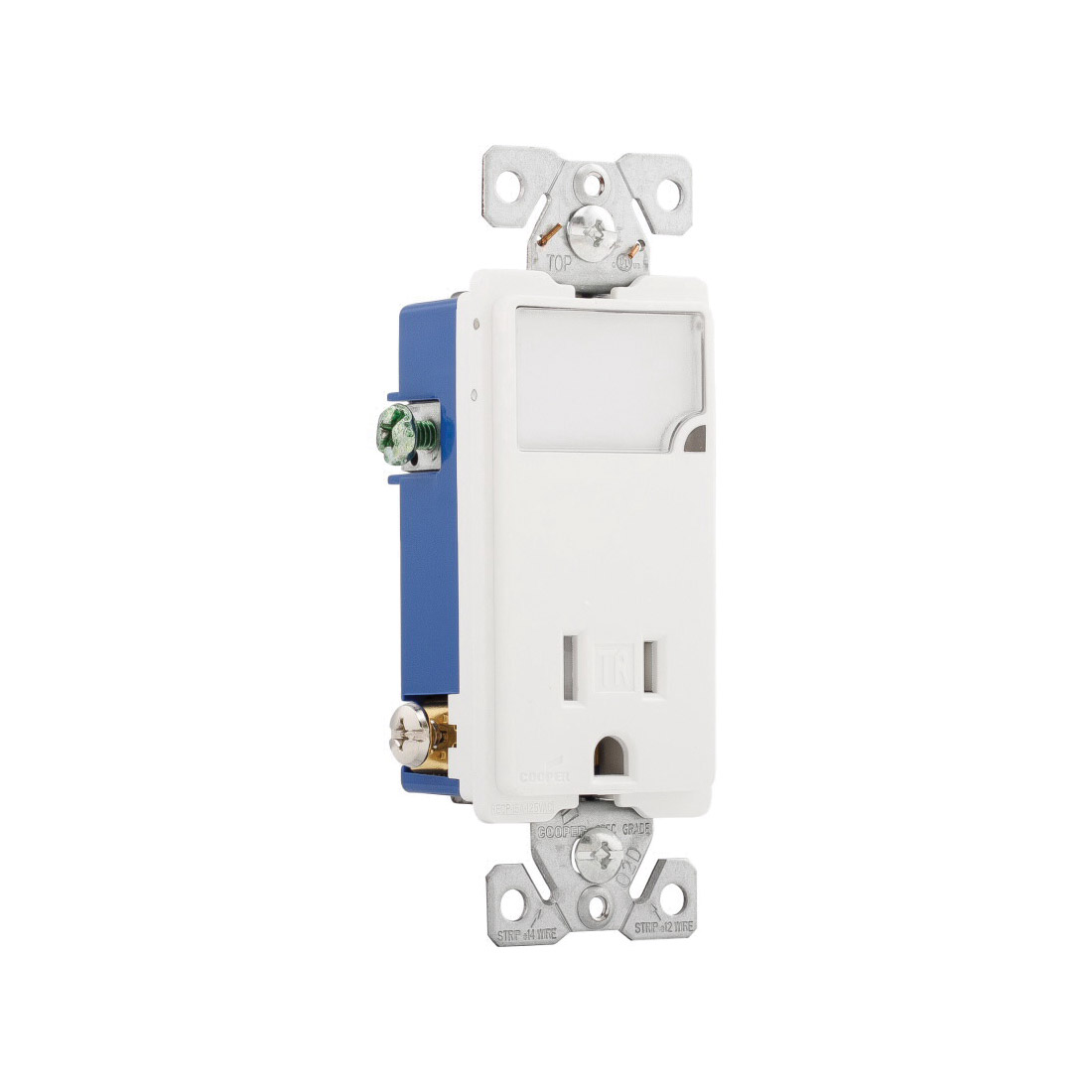 Eaton Nightlight and Combination Receptacle, 120/277 V, 15 A, Number of Poles: 2, Number of Wires: 3, Wiring Type: Back and Side, Wire Size: 14 to 12 AWG, NEMA Configuration: NEMA 5 to 15R, Flush Mounting, Thermoplastic, Dimensions: 2 in L x 2 in W x 4-1/4 in H