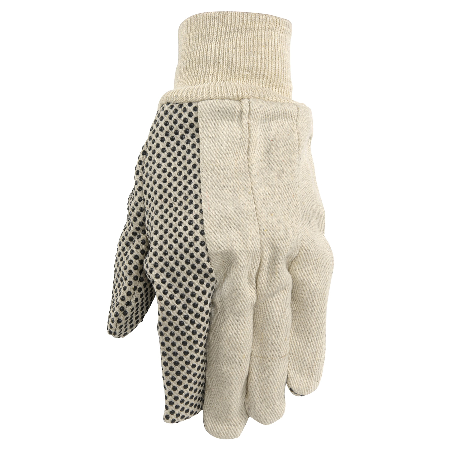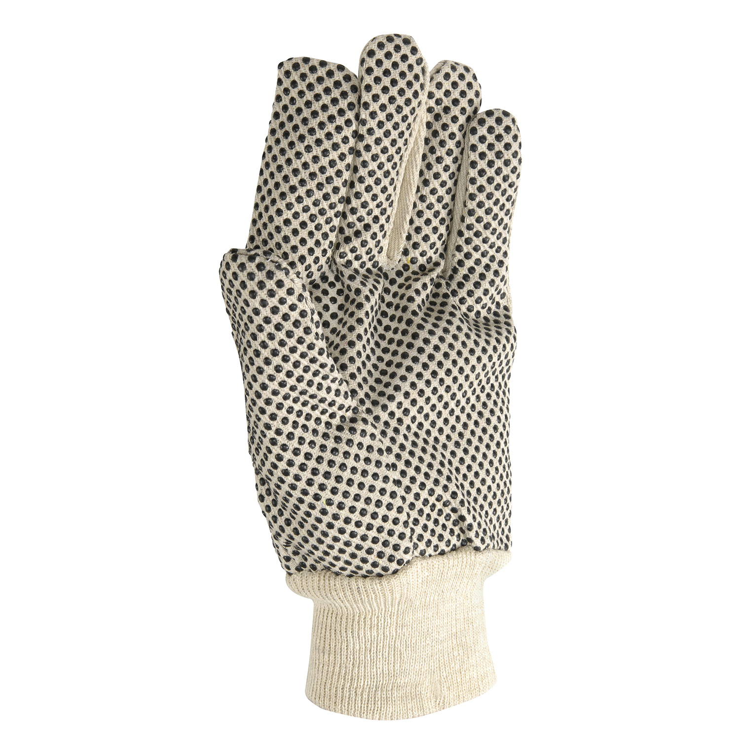 Wells Lamont 309K economy dotted canvas work gloves protect your hands while you're hard at work. The economy-grade polyester/cotton canvas fabric is durable and comfortable. The palm, thumb and first finger are dotted for extra grip. These gloves have a straight thumb design and the clute cut of the gloves ensures that the palm has no seams. These Wells Lamont 309K economy dotted canvas work gloves have a knit wrist to help keep dirt and debris out.