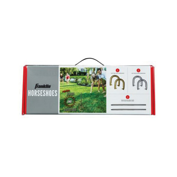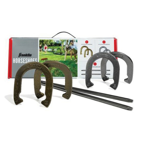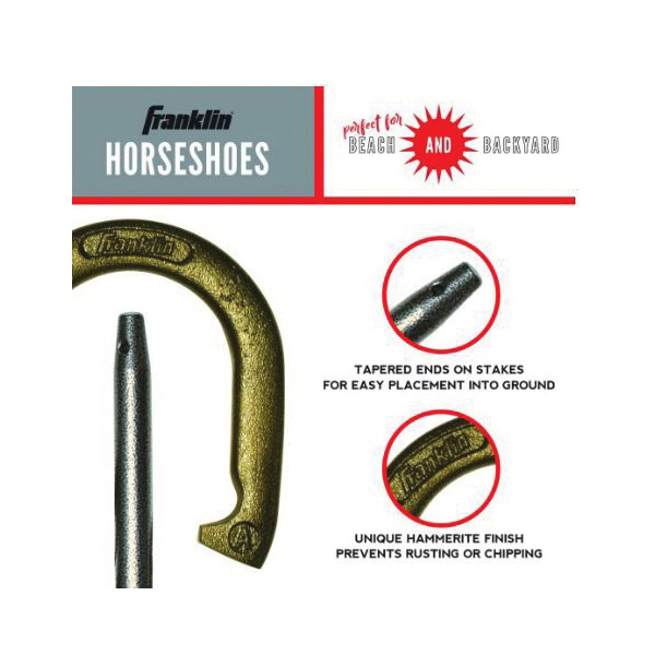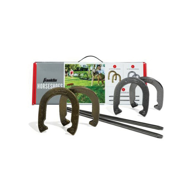 It's all in the details. This fun horseshoe set from Franklin Sports is all you need to set the vibe and get the party started at your next picnic or beach BBQ. The set includes four official size and weight cast iron horseshoes and two 20 in solid forged steel stakes.