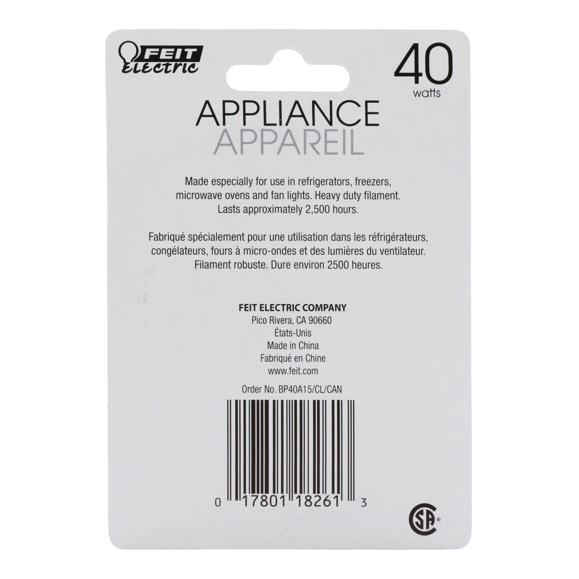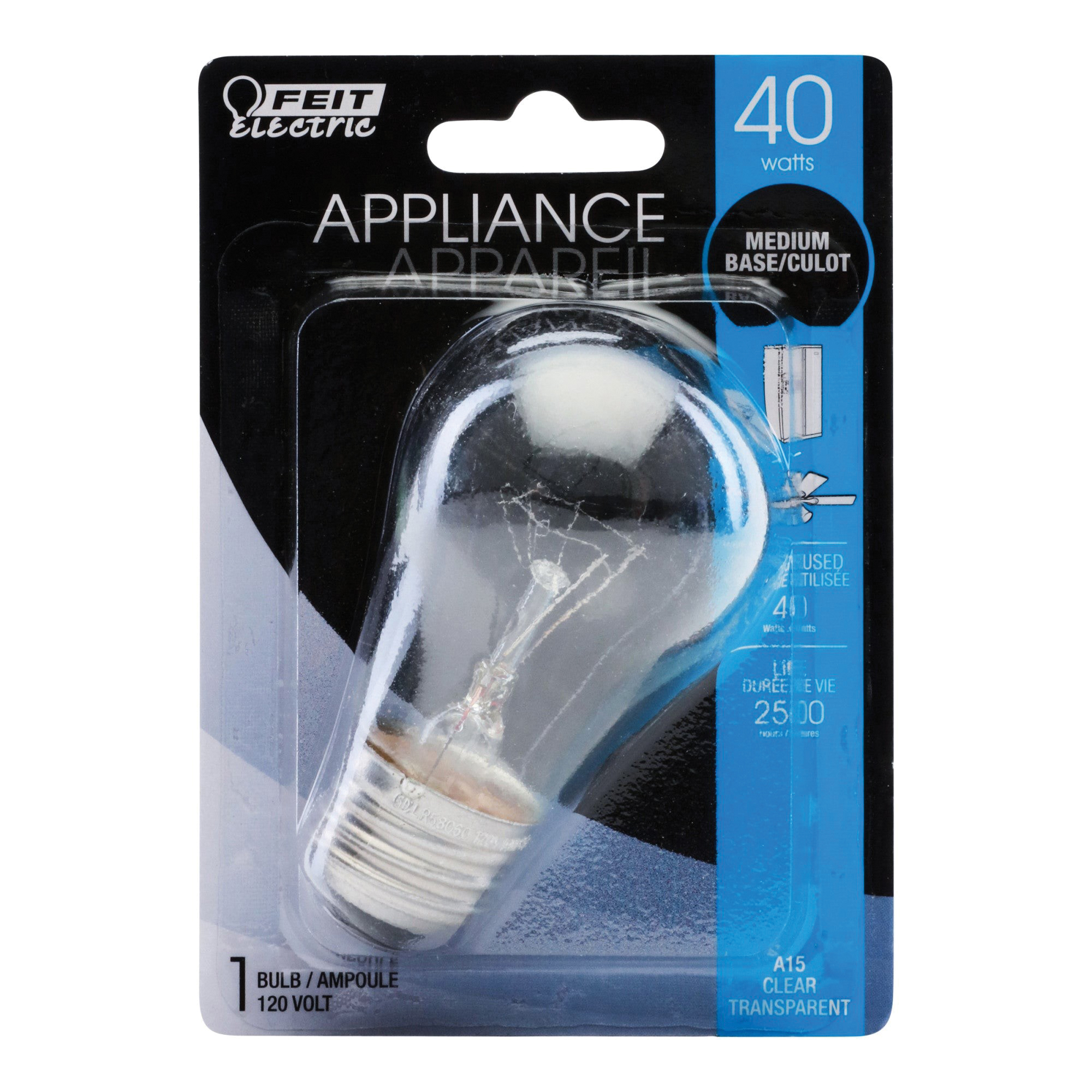 This Feit Electric 40 W incandescent clear A15 specialty light bulb can be used for appliances or special use applications. It has an E26 medium base, an average of 2500 hr and operates at 120 V. Choose a dependable Feit Electric specialty use light for your home or business.