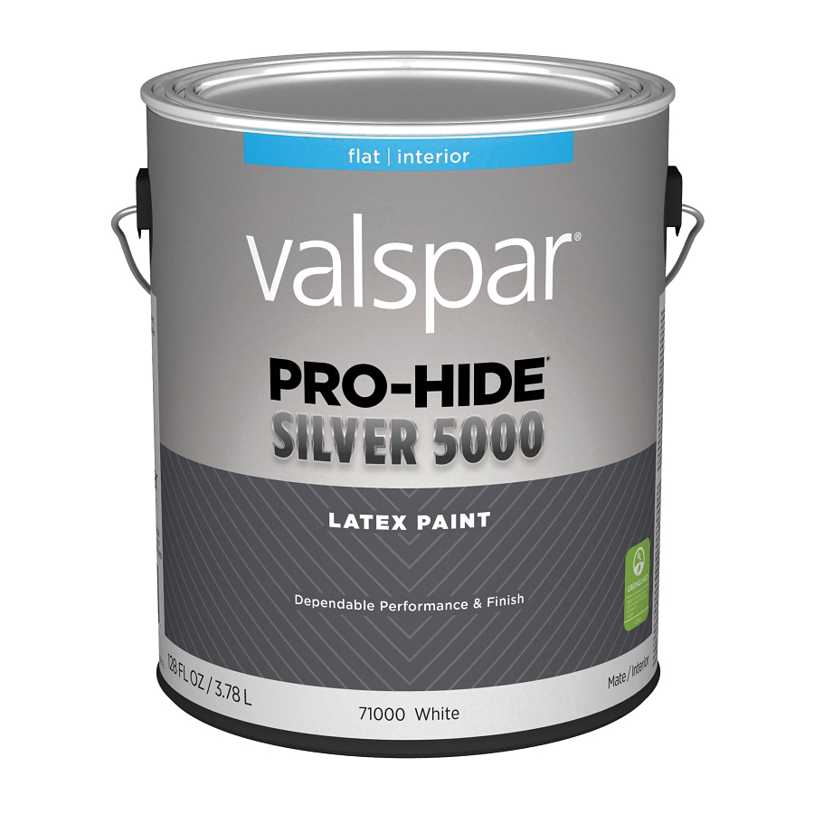 Valspar Pro-Hide Silver 5000 7100 028.0071000.007 Latex Paint, Water Base, Flat Sheen, White Base, 1 gal, Metal Can