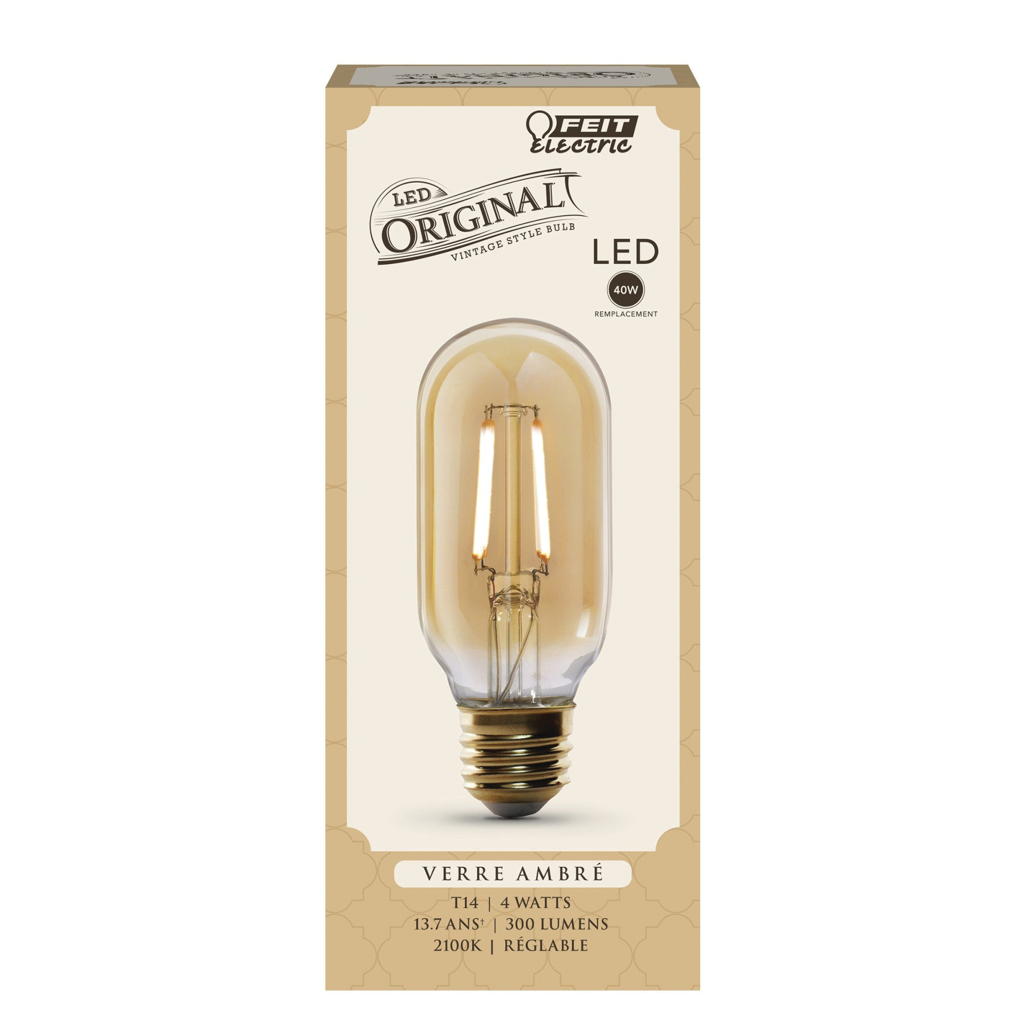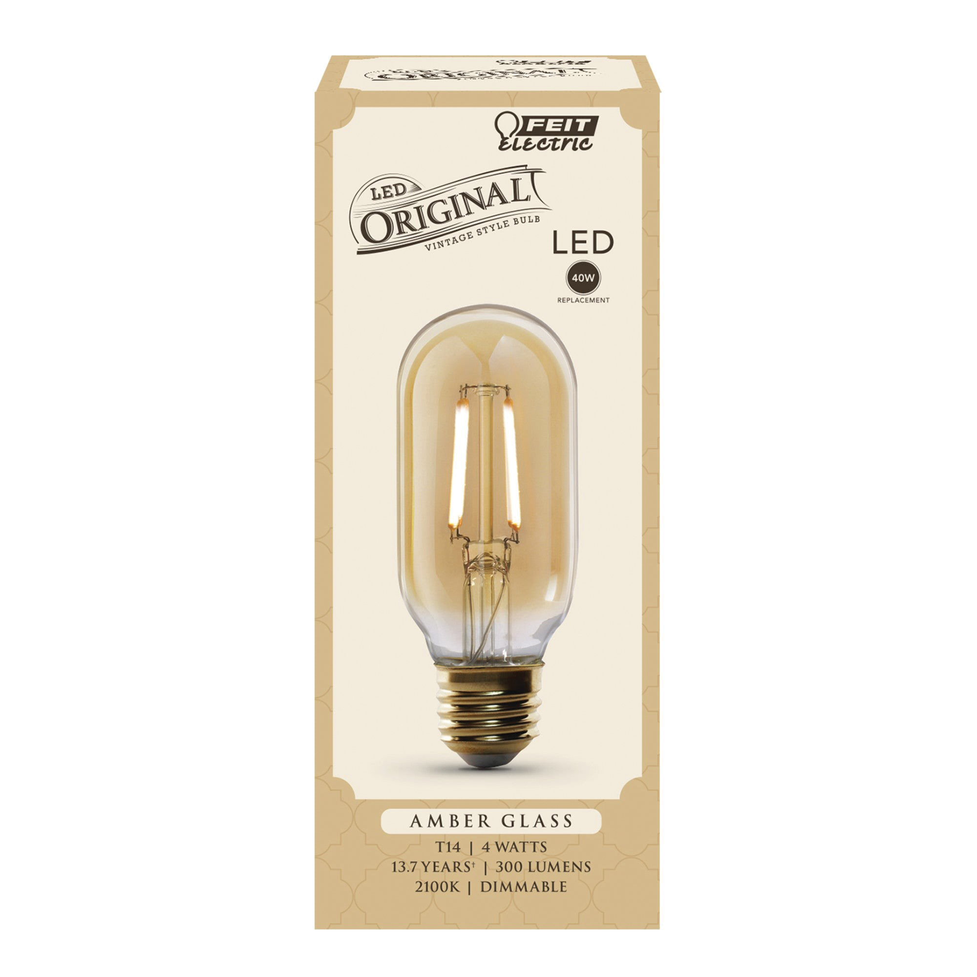 Enjoy all the benefits of advanced LED energy-saving technology with the dimmable Feit Electric T14 4 W The Original Vintage LED light Bulb. Add dramatic vintage style with lighting normally seen in high-end restaurants or hotels. This bulb produces a light output of 300 Lumens and uses 4 W of electricity. Get instant ON to full brightness with relatively cool running performance. The Original Vintage T14/VG/LED, LED light bulbs have an average life of 15,000 hr/13.7 years are RoHS compliant and are 100% mercury-free. Choose a dependable decorative bulb for residential or commercial applications.