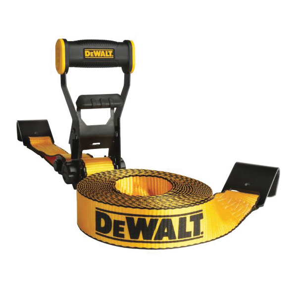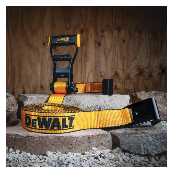 DeWALT® 10,000 lb break strength flat hook ratchet strap features an ergonomic handle, weather-resistant ratchet components and straps to easily and safely secure cargo loads on flatbed trailers or motorcycles and kayaks. GUARANTEED TOUGH®.