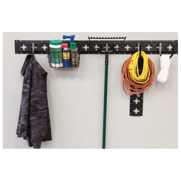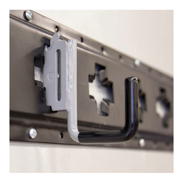 The CargoSmart premium small square hook works great to store different styles of tool bags, equipment and tools. Constructed with a spring-loaded fitting that clips into X-Track® and E-Track rails to provide a safe and secure connection. A flat-bottom design makes this an ideal hook for storing smaller items in enclosed trailers or garages.