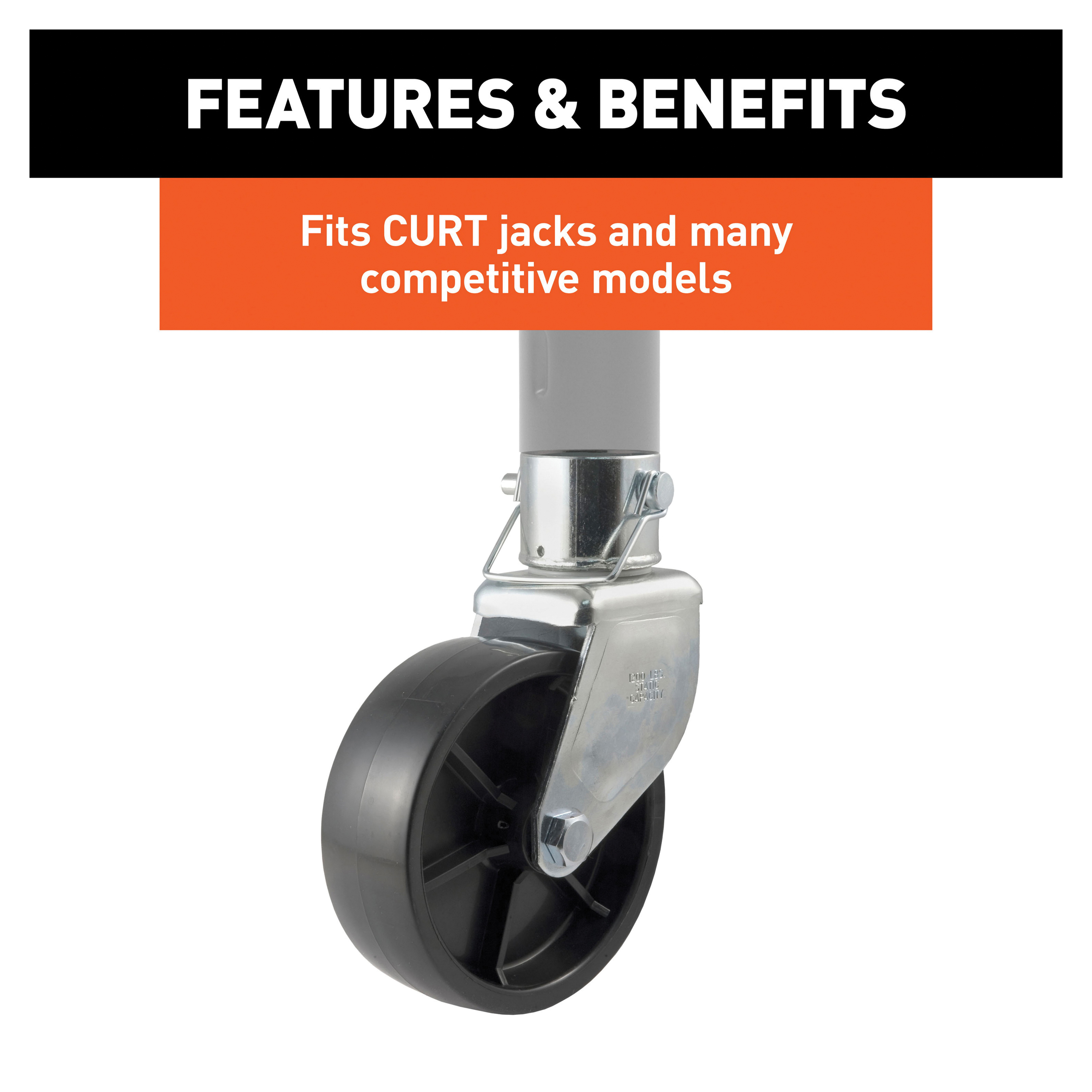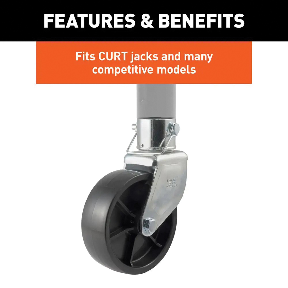 In our goal of being your excellent source for all things towing, the Curt line of trailer jacks is designed with care and manufactured with pride. Curt jacks are made with quality to promote the life and function of your trailer and they come in several different styles to accommodate your needs, whether you are a frequenter of the boat landing, the campground, the racetrack or the field. Add stability and mobility to your trailer jack and trailer with a curt jack caster. This hardy jack attachment features a simple safety pin mounting system and can be used on a number of Curt jacks and many competitive models. It comes with a 6 in poly wheel, has a weight capacity of 1,200 lb and is designed for 2 in Dia tubes. It does not matter what kind of trailer you tow a boat trailer, utility trailer, livestock hauler or recreational vehicle trailer if you have a receiver-style trailer, you will want a jack that complements its function. For a trailer jack that will not steer you wrong, Curt has the answer.