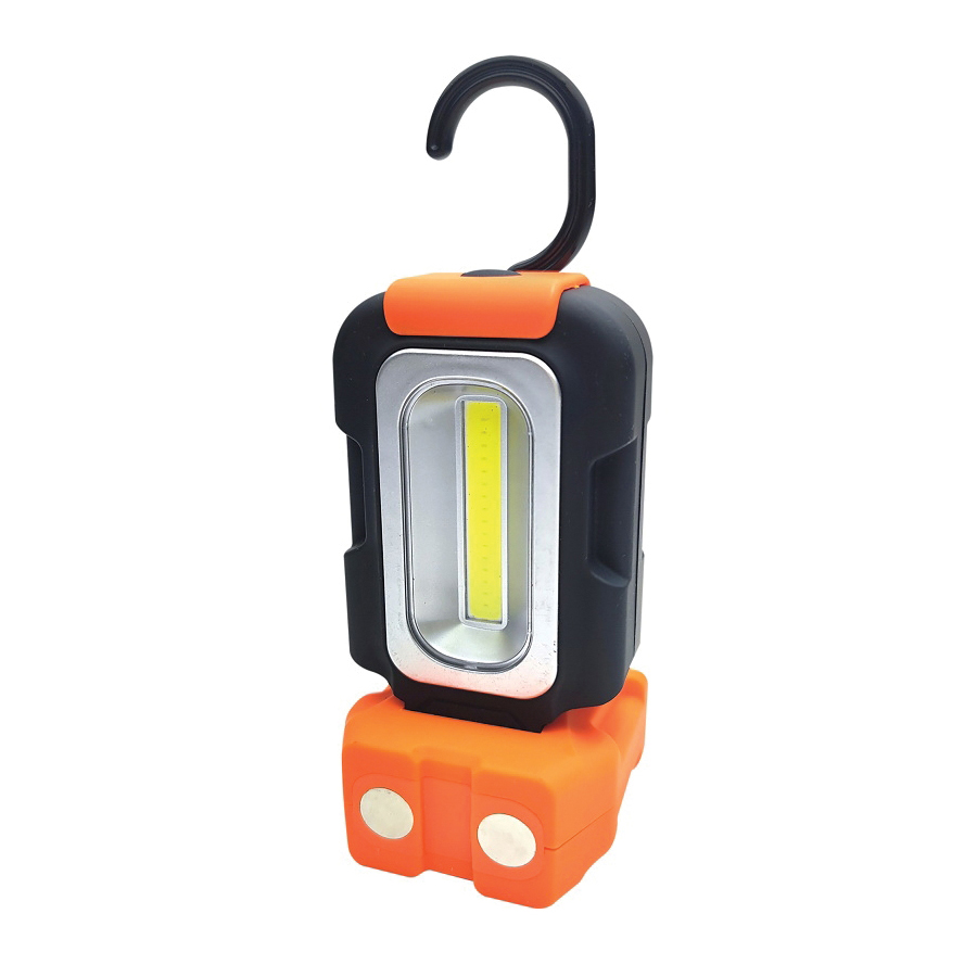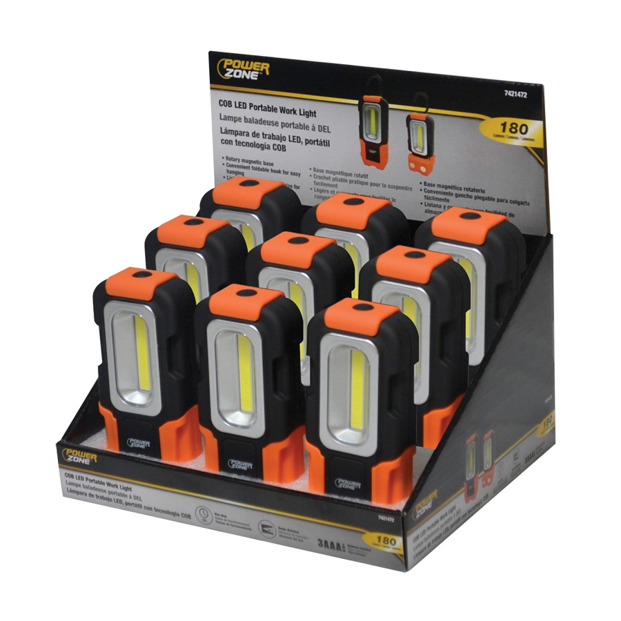 LED Portable Work Light, 180 lumen, Run time: 5 hrs, Beam distance: 6 m. Rotary magnetic base, convenient foldable hook for easy hanging, light weight and compact for easy storage & carrying. 3 AAA batteries included.