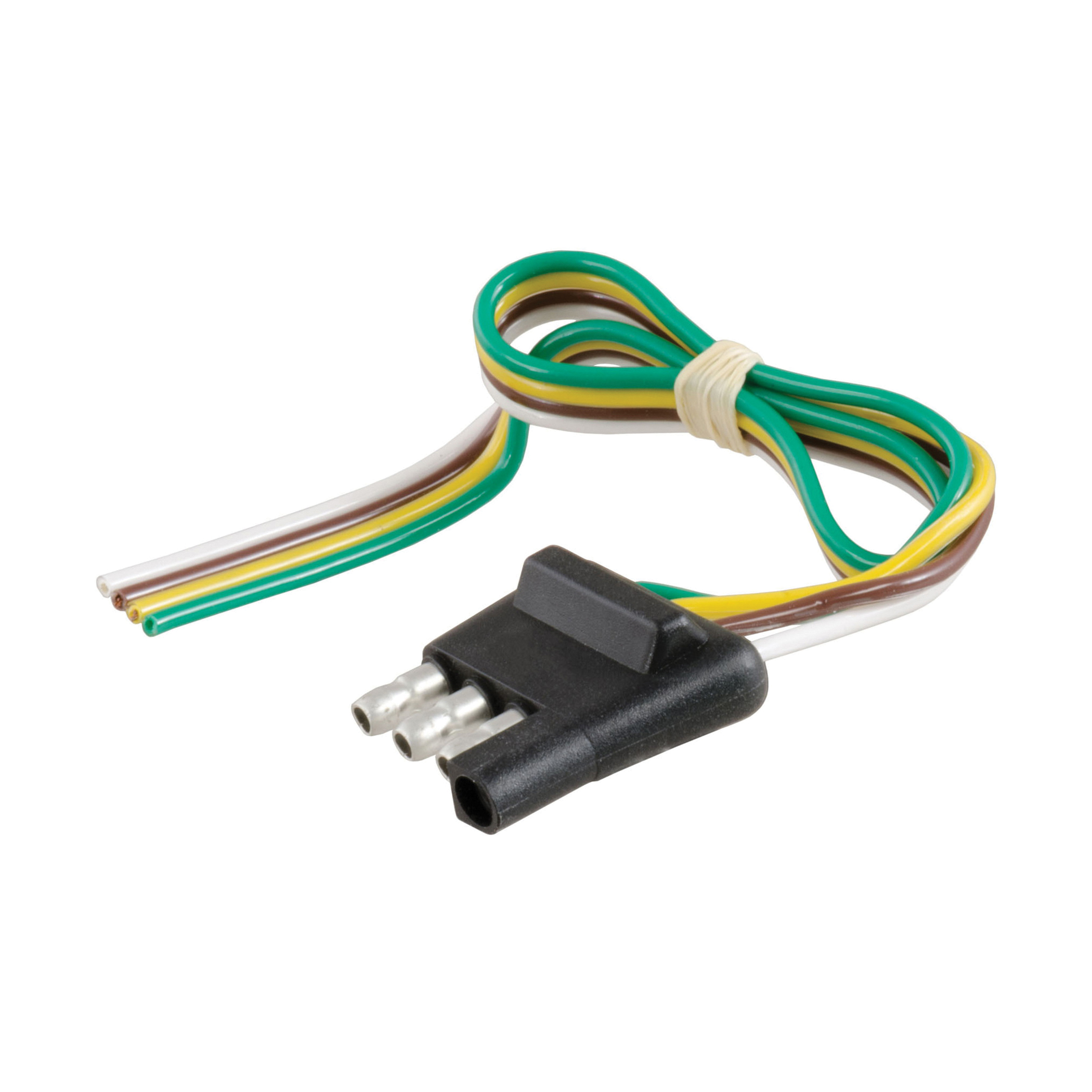 Like trailer hitches and ball mounts, electrical connectors range all over the board in shape, size and capability, but no matter what your trailer's electrical functions are, you need a solid connection to keep the power flowing and ensure safety on the road. Curt electrical connectors are designed and manufactured to give you a reliable connection every time you plug in your trailer. This four-way flat connector is designed to supply power for tail lights, turn signals and brake lights, as well as a ground connection. It features durable rubber-molded construction and is made with 12 in of standard color-coded, bonded wire to easily splice into your trailer's wiring system. This four-way flat connector is a male-end plug, specifically designed for the trailer side of the connection. It is compatible with all two-wire vehicle systems.