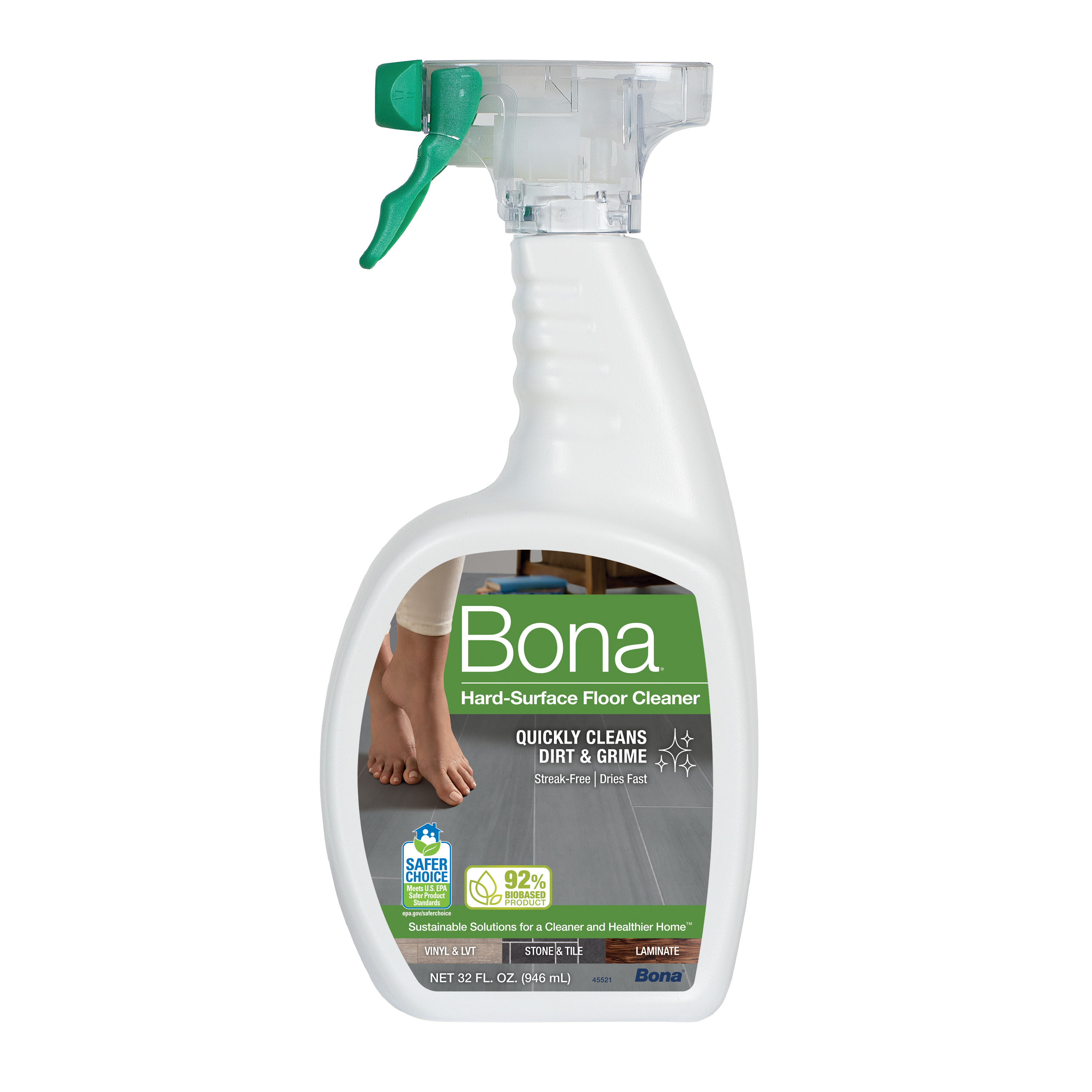 The rinse-free, streak-free formula cleans hard surface floors by removing dust, dirt and grime leaving your floors clean and beautiful. Waterbased solutions and safer choice certification ensure a safer product for people, pets and the planet. The quick and easy Bona® hard surface floor cleaner is made specifically for use on your hard surface floors. Each Bona® floor cleaner is uniquely formulated to care and protect your floor with it's gentle, PH. neutral formula. The rinse-free, streak-free formula cleans multi-surface floors by removing dust, dirt and grime leaving your floors clean and beautiful. Crafted with plant-derived ingredients and containing 92% USDA certified bio-based content for a more sustainable cleaning experience. Love your floors with Bona. Waterbased solutions and safer choice certification ensure a safer product for people, pets and the planet.