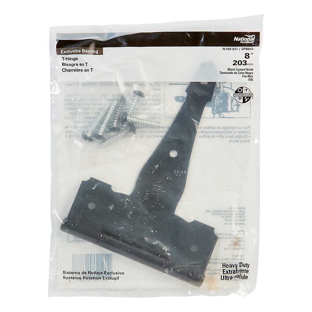 National Hardware SPB841 T-Hinge, 60 lb Weight, Door Leaf Height: 8 in, Pin Type: Tight, Steel, Black, Dimensions: 9-11/16 in L x 5-1/2 in H x 1/8 in THK