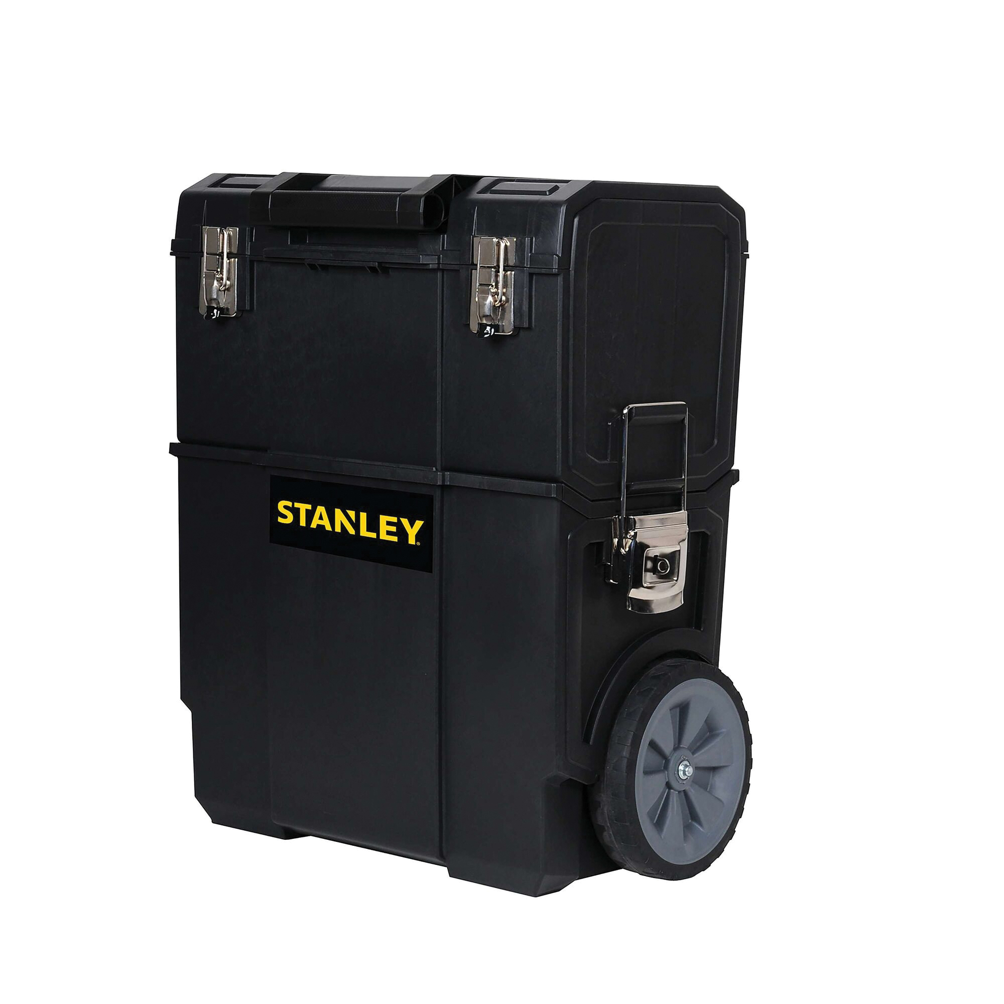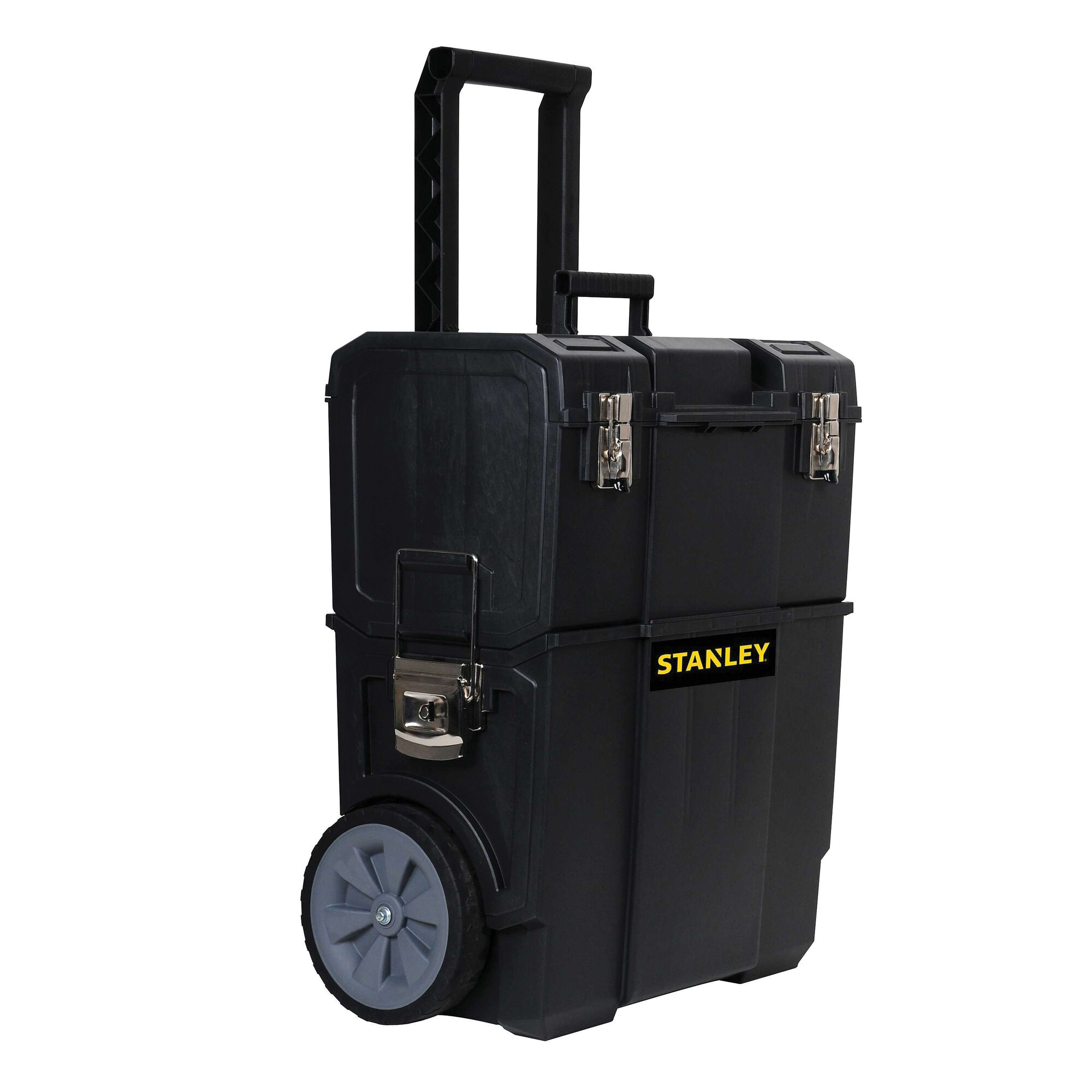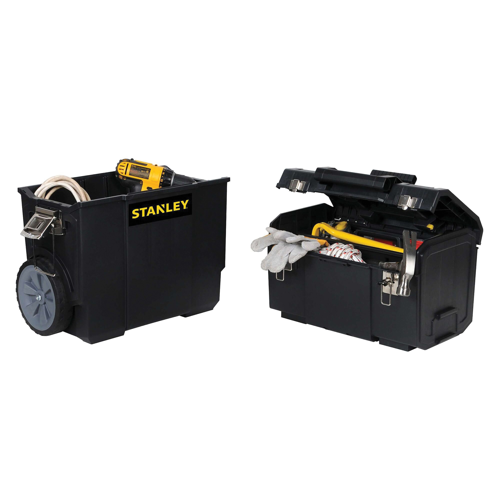The Stanley® 2-in-1 mobile workshop has a large top compartment and a large bottom bin, with large metal side latches and a padlock eye for locking. The top tool box can be separated and carried individually and a removable tray allows enough space for larger tools to be stored in the lower bin.