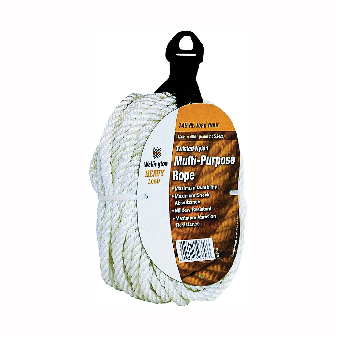 Wellington 16356 Rope, Twisted Rope Construction, Splice Eye End, 1/4 in Dia, 50 ft L, 136 lb Working Load, Nylon, White