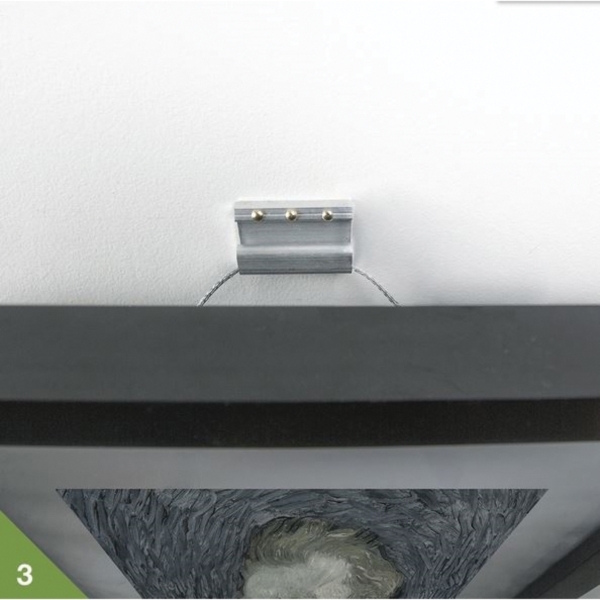Hangs pictures with wire up to 30 lb. Broad pivot point of hanger keeps picture level. Included level ensures perfect installation. Extruded lip provides extra security. No wall damage. No screws or anchors required. Foam backing protects walls from scuffing. Hanger will not show above frame. Reusable.