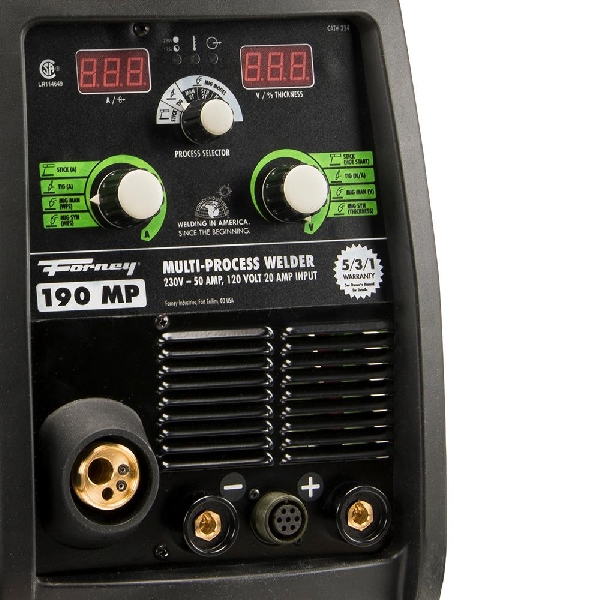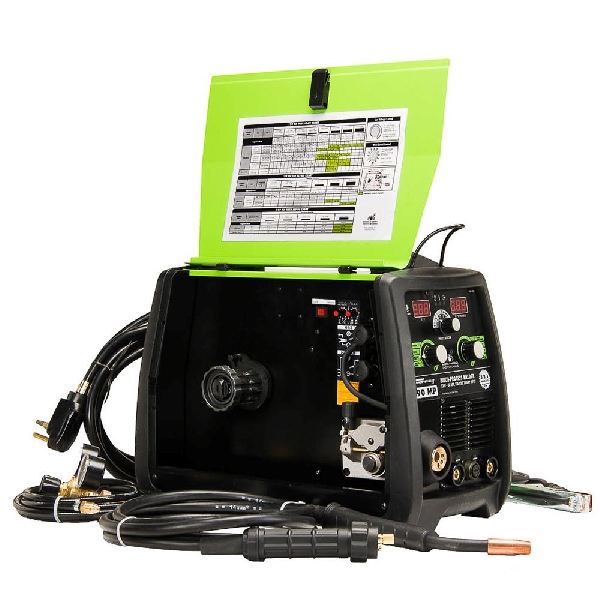Forney 3-in-1 Welder, Input Voltage: 230/120 V, Rated Output: 170 A, Wire Size: 0.035 in, Cable Length: 15 ft, Green, Dimensions: 19 x 9-1/2 x 16-1/2 in, Weight: 43 lb, Includes: 85516 Adapter Cord, 85663 Gas Hose, 85667 10 ft Ground Cable, Clamp, 85500 10ft Premium MIG Gun, 85662 Regulator, 85669 Stick Electrode Holder