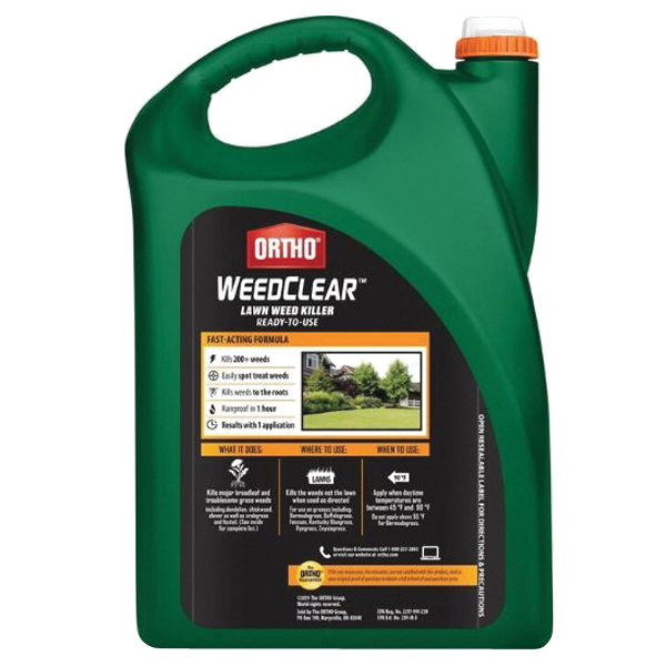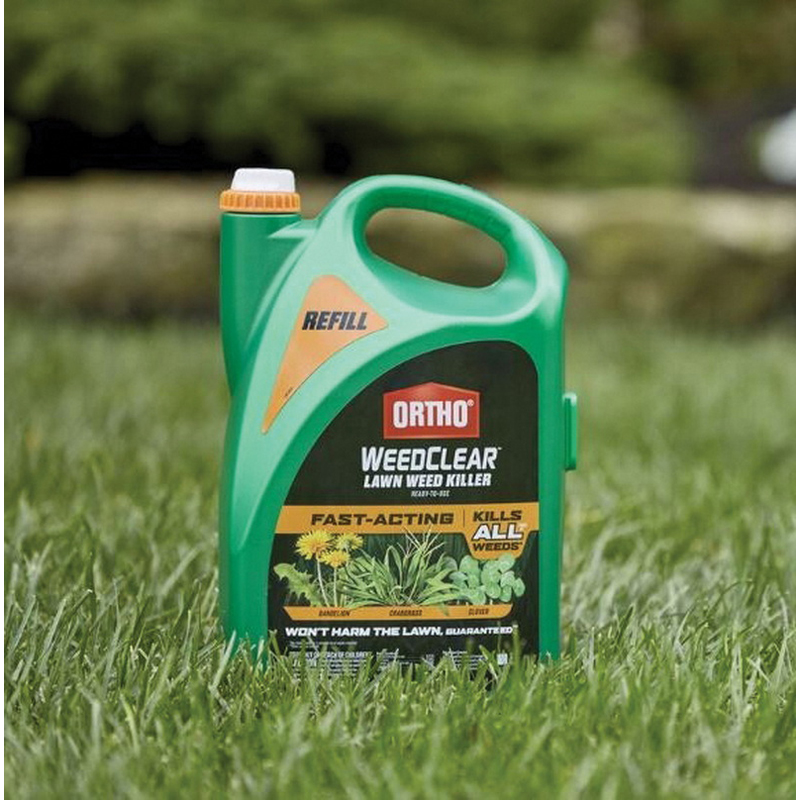Kill weeds down to the root without harming your lawn. Ortho WeedClear™ lawn weed killer ready-to-use refill controls and suppresses over 200 types of weeds, including all major broadleaf weeds like dandelion, chickweed, clover and crabgrass, yet won't damage your grass (when used as directed). The fast-acting formula is rainproof in 1 hr and delivers visible results after just one application. Specially formulated with three proven weed killers that when sprayed on the leaves, work through the plant to kill and control all the way down to the root. To use, install the Trigger Sprayer or the battery-powered Comfort Wand from your previous bottle, to easily reach and spot-treat weeds with a continuous stream no bending or pumping required. Better to apply when weeds are young and actively growing. Recommended for use on multiple lawn varieties including Bermudagrass, Buffalograss, Fescues, Kentucky Bluegrass, Ryegrass and Zoysiagrass. People and pets may re-enter once treated area has dried.