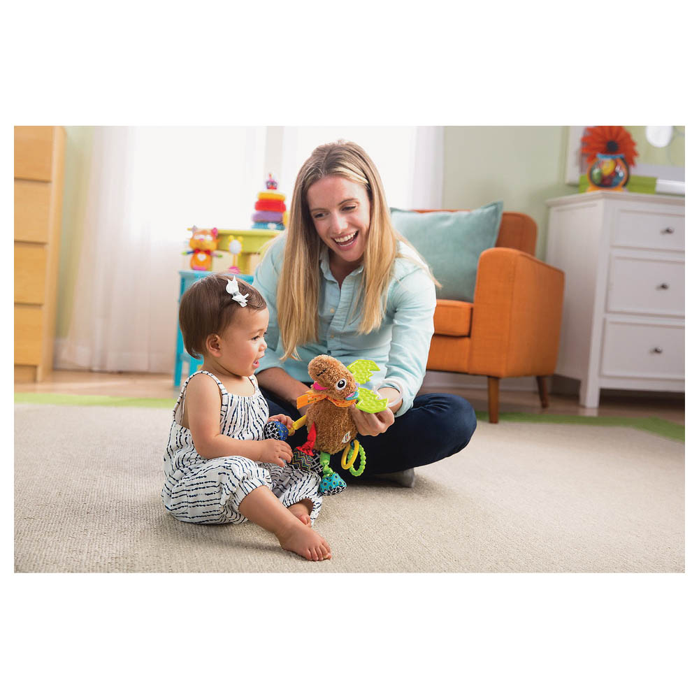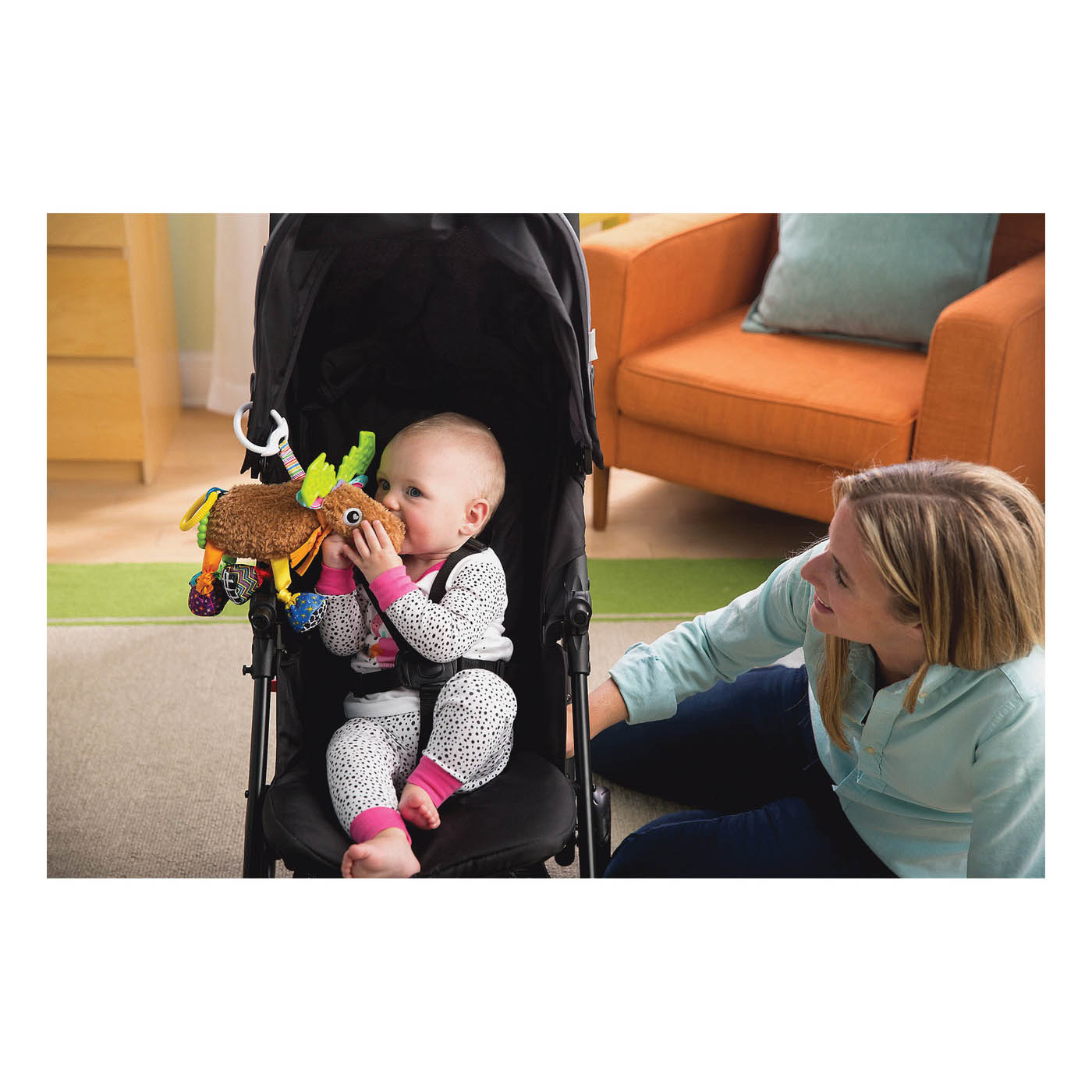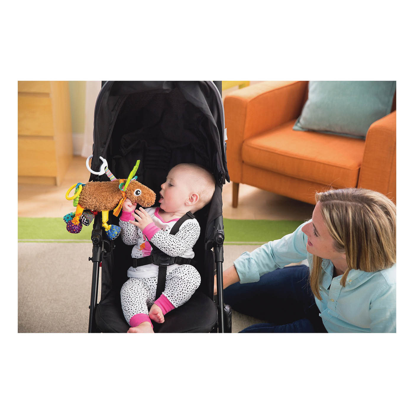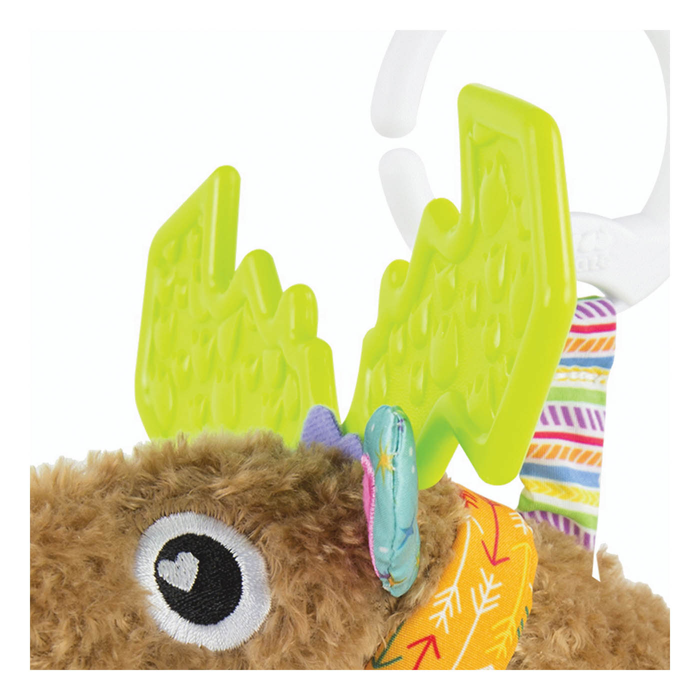 The Lamaze Mortimer the moose is a developmental toy that features plenty of fun for your little one to explore. Mortimer has colorful, satin, knotty legs and multiple textures on his hooves with fun crinkles and jingles. Squeeze his tummy to show baby how it squeaks! Mortimer also features contrasting patterns and multiple bright colors that helps with visual development during play time. Babies explore using both their hands and mouths and Mortimer's antlers are great for chewing! The Lamaze on-the-go clip lets you hook this cute baby toy to strollers, carriers and diaper bags for fun where ever you go.