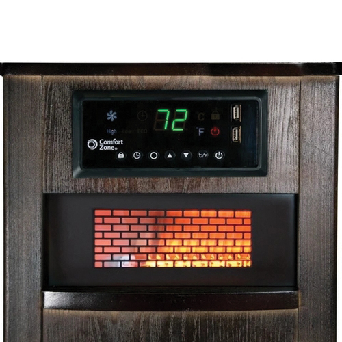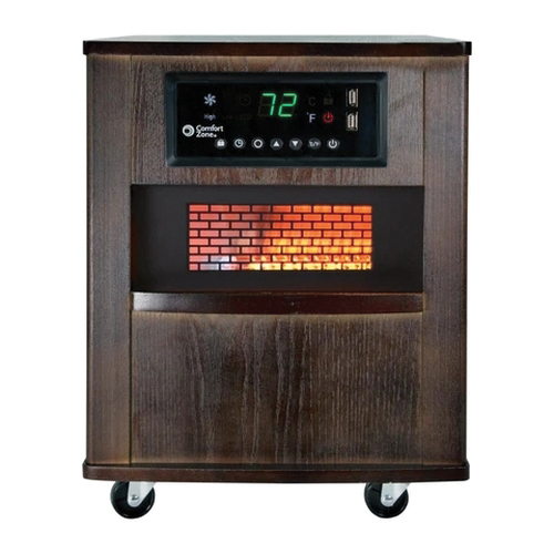 Comfort Zone Cabinet Heater, 120 V, 12.5 A, 1500 W, 5120 Btu, Heating Method: Infrared, 1800 sq-ft Heating Area, Element Type: Quartz, Digital Thermostat Control, Wood, Walnut Brown, 19-1/4 in H x 13 in W x 18-3/4 D Dimensions