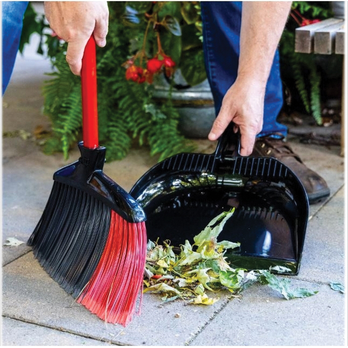 The indoor/outdoor angle broom with dustpan includes a patented extra-wide angle-style broom and a dustpan with plastic teeth to remove debris. The broom's two contrasting color bands contain fibers from recycled water bottles.