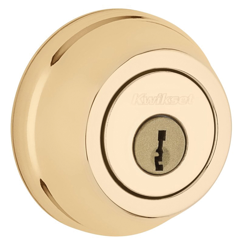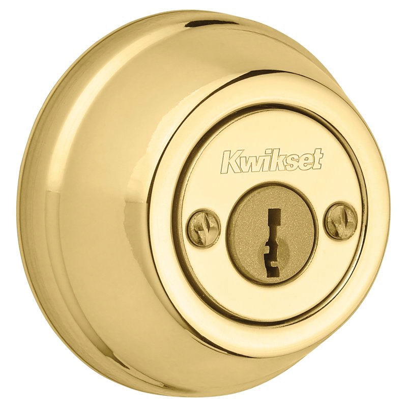 Kwikset Signature Series 780 Deadbolt, Design: Traditional, Security Grade: 2, Number of Cylinders: 2, Cylinder Type: Pin, Tumbler, Keyway Type: K3, KW1, Key Type: Keyed, Strike Type: Round, Square Corner, Strike Size: 1-1/4 x 3-5/8 in, Backset Type: Adjustable, Backset Size: 2-3/8 to 2-3/4 in, Latch Type: 6-Way, Adjustable, Throw Length: 1 in, Cross Bore Diameter: 2-1/8 in, Edge Bore Diameter: 1 in, Projection Size: 1-1/8, 15/16 in, Door Thickness: 1-3/8 to 1-3/4 in, Interior Locking: Key, Zinc, Polished Brass, Dimensions: 2-5/8 in W x 2-5/8 in H, Includes: (2) Keys, Latch, Strikes and Screws