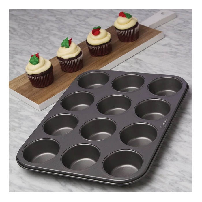 • Ecolution BakeIns EIGY-3812 Muffin Pan, 12 Cup Capacity, Carbon Steel, Dishwasher Safe: Yes