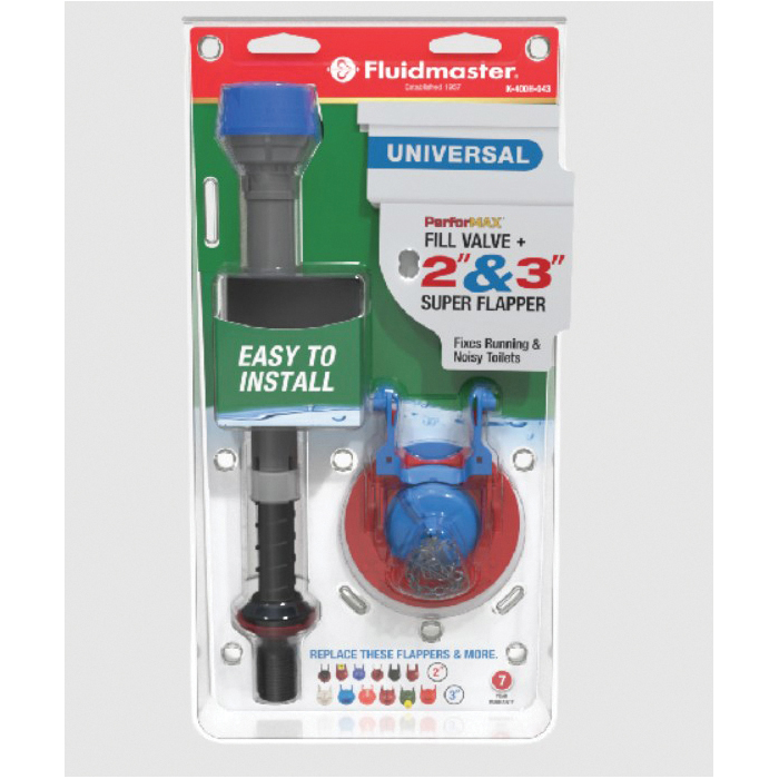The Fluidmaster universal PerforMAX fill valve 2 and 3 in super flapper is the newest kit with the most technologically advanced universal toilet flapper and fill valve on the market. This two-piece kit is the excellent solution to fix noisy, running toilets. It takes all the guess work and uncertainty out of deciding what pieces or sizes of flappers to buy to fix your toilet. This kit includes our most powerful toilet fill valve PerforMAX and our newest toilet flapper that replaces either a 2 or 3 in flapper the super flapper. The PerforMAX fill valve sets the standard for performance and is quick and easy-to-install. It is the most powerful fill valve on the market with 2X greater bowl refill for a more powerful flush.