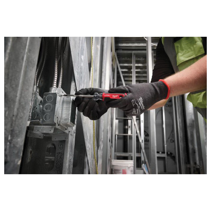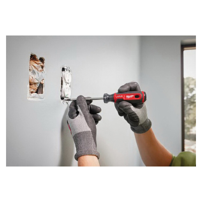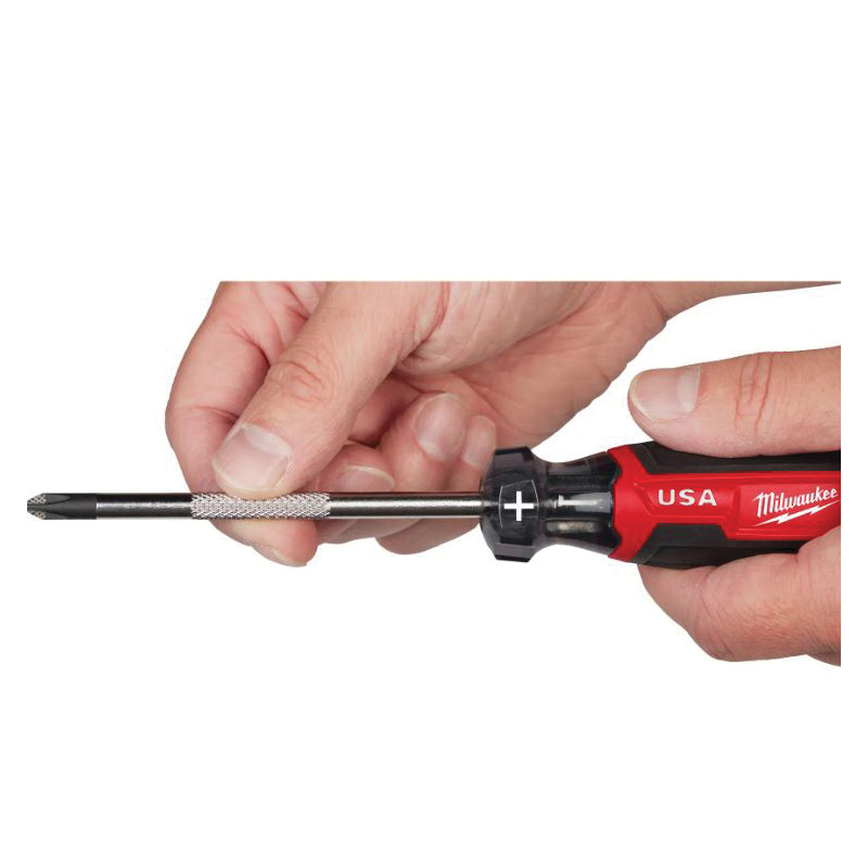 Our Milwaukee® cushion grip screwdrivers (USA) are manufactured to give the professional the excellent-fitting screwdriver with max grip. Our screwdriver tips are custom machined to deliver a precise fit and reduce stripping during demanding fastening applications. For added confidence, the tips are laser etched to increase the gripping surface. Manufactured with high-strength boron-infused steel for increased hardness, our screwdrivers stand-up to the demands of the site with ultimate durability and life. Providing increased versatility, select screwdrivers include a wrench ready bolster for added torque and a knurled shank for precision control. Quick identification markings on the handle make it easy to identify screwdriver tip size and type, including Phillips, cabinet, ECX, slotted and square. The demolition screwdrivers also include a hammer-ready strike cap. Our Milwaukee® cushion grip screwdrivers (USA) are made in the USA with excellent-in-class manufacturing technology and USA-sourced materials all backed by a complete lifetime warranty.