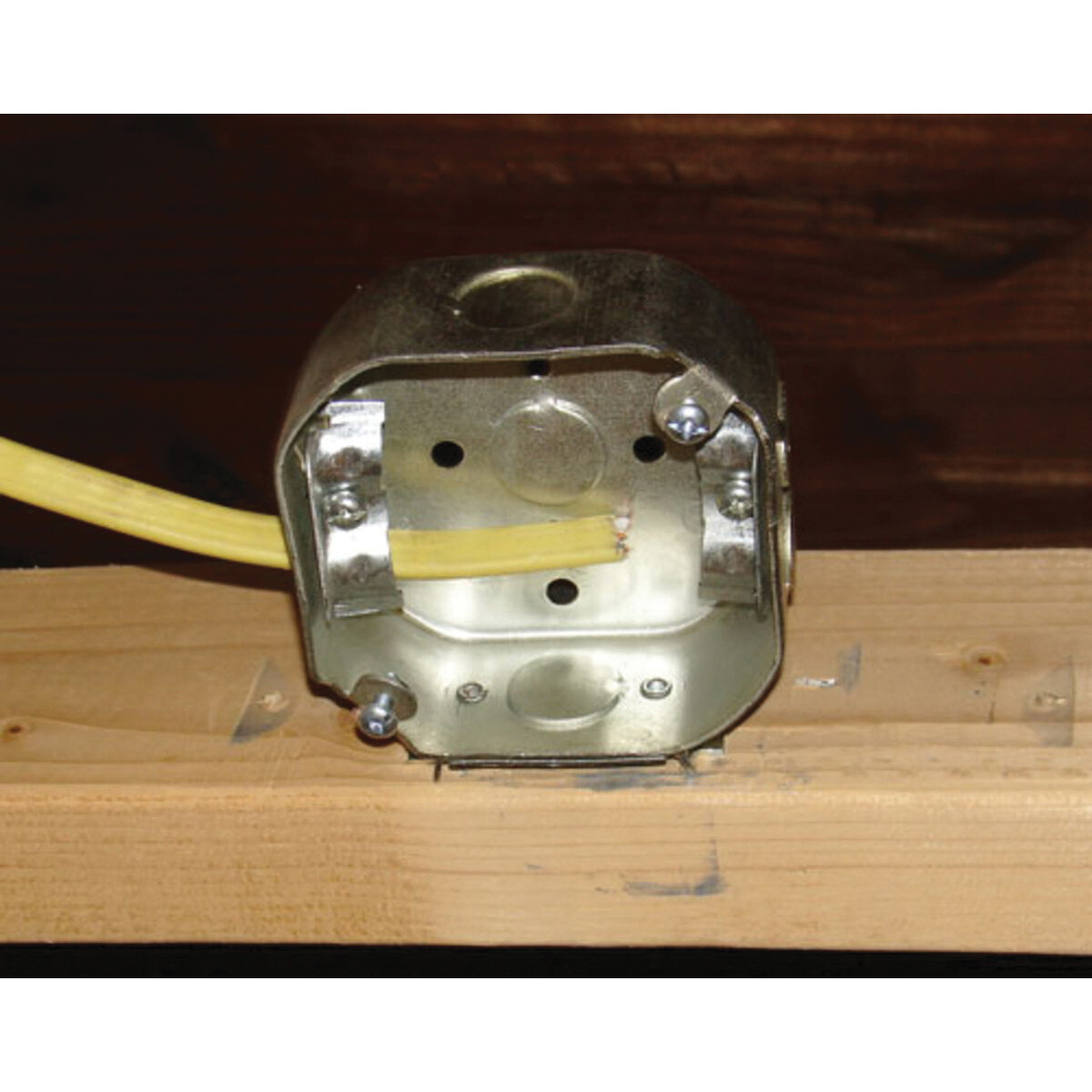 Southwire Octagon Box, Number of Knockouts: 6, Cable Entry: Knockout, Cubic Capacity: 14 cu-in, Housing Material: Steel, Galvanized, Silver, 4 in OAW, Overall Depth: 1-1/2 in, Includes: Nail Spike Bracket, NMSC Clamp and Mounting Screws
