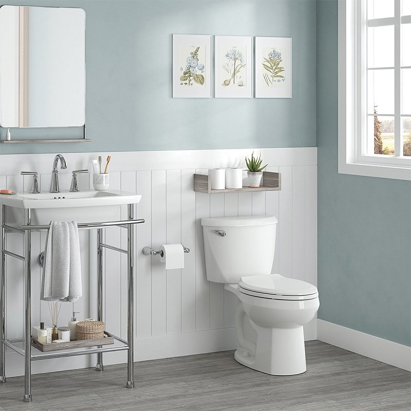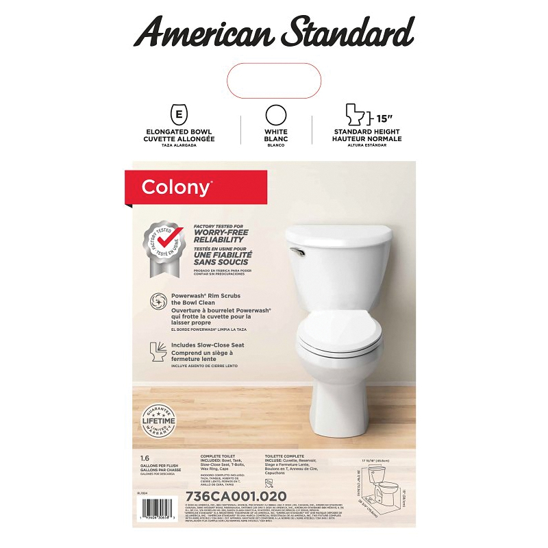 American Standard Complete Toilet, Flush Rate: 1.6 gpf, Bowl Shape: Elongated, Water Surface Area: 9 x 8 in, Rough-In Size: 12 in, Trapway Size: 2 in, Flush Valve Size: 3 in, Overall Dimensions: 29.38 in H x 19.19 in W x 29.75 in D, Rim Height: 15 in, Vitreous China, White, Floor Mounting, Includes: Color-Matched Seat