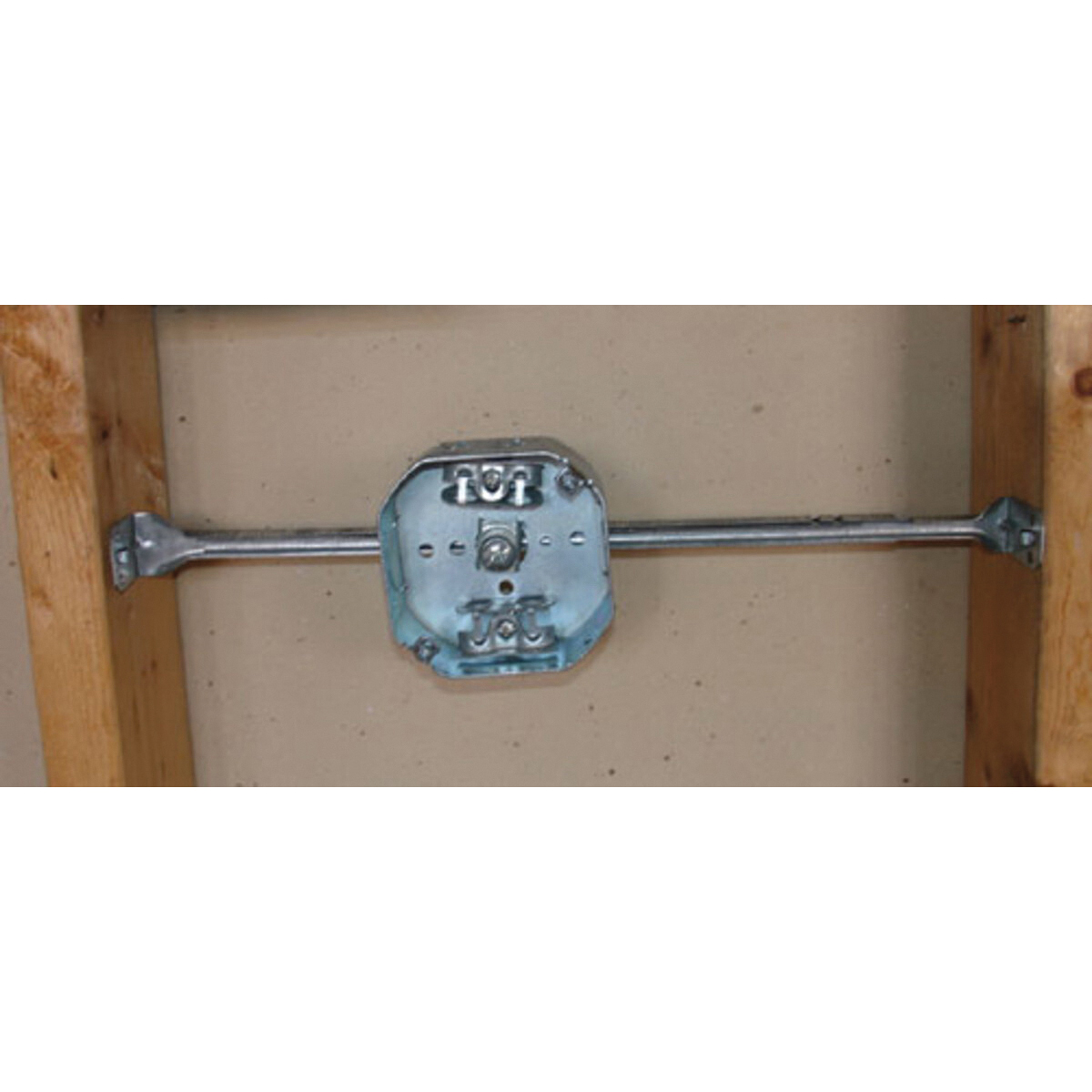 Southwire Octagon Box, Number of Knockouts: 6, Cable Entry: Knockout, Cubic Capacity: 15.5 cu-in, Housing Material: Steel, Galvanized, Silver, 4 in OAW, Overall Depth: 1-1/2 in, Includes: 16 to 24 in Adjustable Bar and MC/BX Clamps