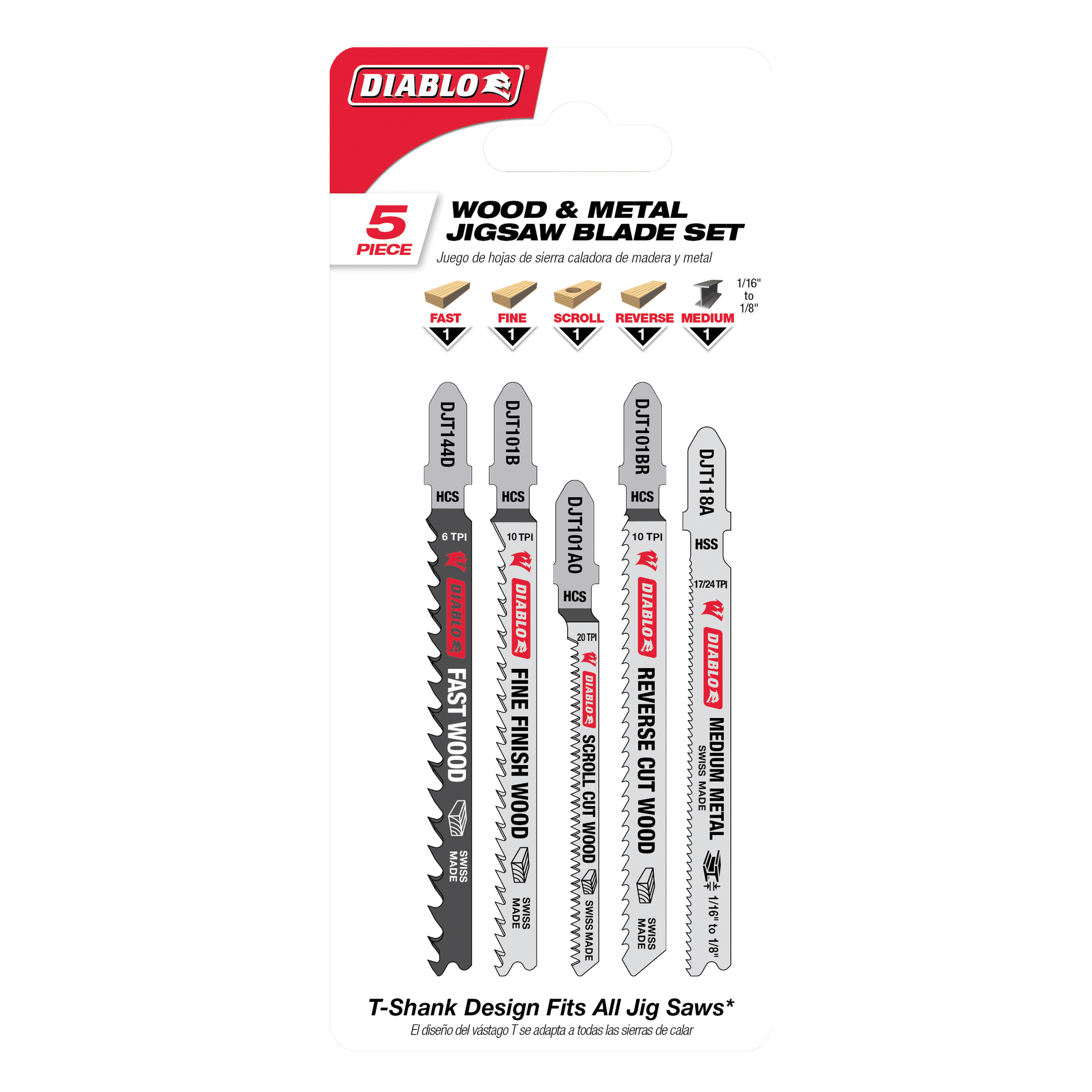 Diablo's HCS and HSS jig saw blades are designed for high-performance cutting in wood and metal applications. Each blade included within this set is optimized to deliver effortless, clean cuts in wood or metal. T-shank design fits all combo and most U-shank cordless and corded jig saws.