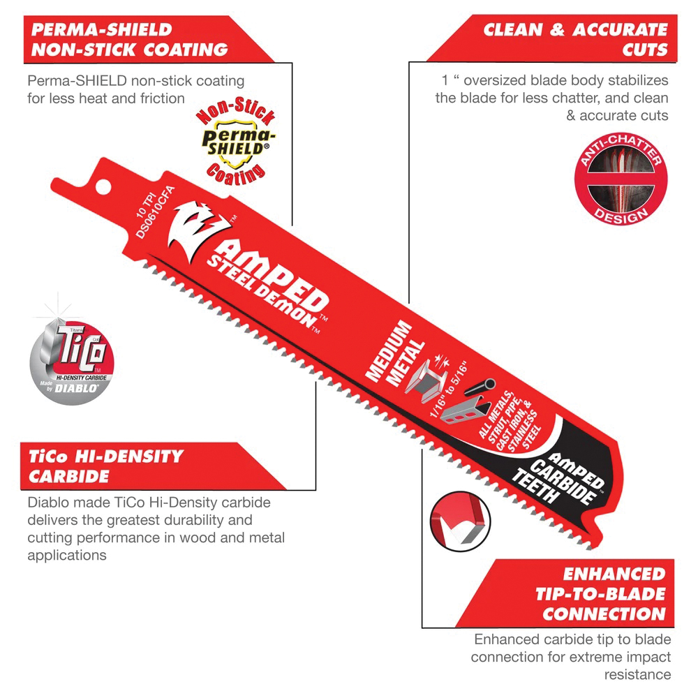 Diablo's new range of Steel Demon® AMPED™ reciprocating saw blades are "AMPing Up" medium metal cutting with the introduction of the industry's first ever industrial grade coating, Black industrial cooling element (I.C.E.). The ultra-slick Black I.C.E. provides the coolest and cleanest cutting edge, and an ultra-superior chip evacuation. High-Performance carbide delivers an unmatched up to 100 times longer cutting life versus standard bi-metal blades in strut, pipe, stainless steel and all other metals ranging in thickness from 1/16 in to 5/16 in. The combination of Black I.C.E. and Diablo's carbide delivers extended life and an impressive up to 2X increased performance vs standard metal cutting carbide reciprocating saw blades.