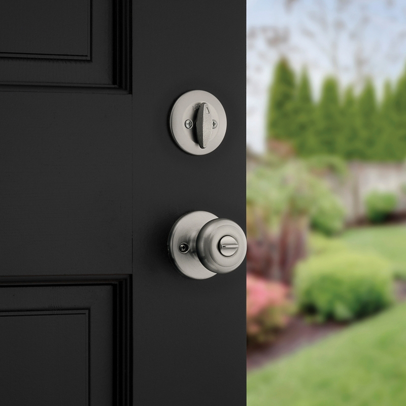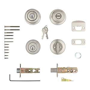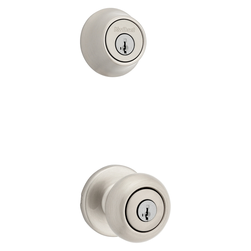 Kwikset Entry Knob and Single Cylinder Deadbolt, Classic, Colonial, Traditional Design, Satin Nickel, Interior Locking, 3 Grade, Re-Key Technology: SmartKey, Rekeyable/Resettable: Rekeyable, Metal, KW1, SC1 Keyway, Door Handing: Left, Right, 1 -Cylinder, Residential Commercial/Residential, 2-3/8 to 2-3/4 in Backset, Adjustable Backset, 1-3/8 to 1-3/4 in Door Thickness, Includes: Full Lip Round Strike