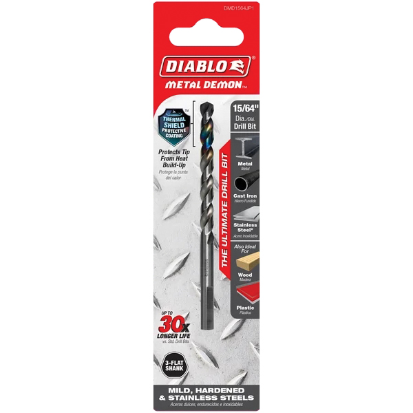 Diablo's Metal Demon™ drill bits redefine metal drilling with the industry's first three-in-one bit to tackle all metals: mild, hardened and stainless steels. Long-gone are the days where professionals must purchase and carry multiple bit types (titanium, cobalt and black oxide), the Metal Demon™ bit's exclusive design brings a one-bit solution for any application ensuring maximum durability, speed, precision and productivity. Diablo's proprietary Thermal Shield Protective Coating™ creates a multi-layered protective barrier around the tip to shield against heat, maximizing durability and increasing the bit's life up to 30X longer than titanium, cobalt or black oxide metal drill bits. Cutting Edge™, an automated precision CNC grinding process, ensures strict industrial standard angle tolerances that create a cutting motion to minimize bit wear allowing for faster hole drilling up to 2X than other bits. A 130 deg hybrid split point tip design creates fast, on-point starts in both stationary and handheld drills. Productivity is now a concern of the past. Metal Demon's ability to drill up to 50% more holes per battery charge ensures professionals can complete more in less time. An optimized flute design removes metal debris faster, keeping the tip cooler for ultimate strength and durability in all metal drilling applications. The three-flat shank design prevents slippage for accurate hole drilling.