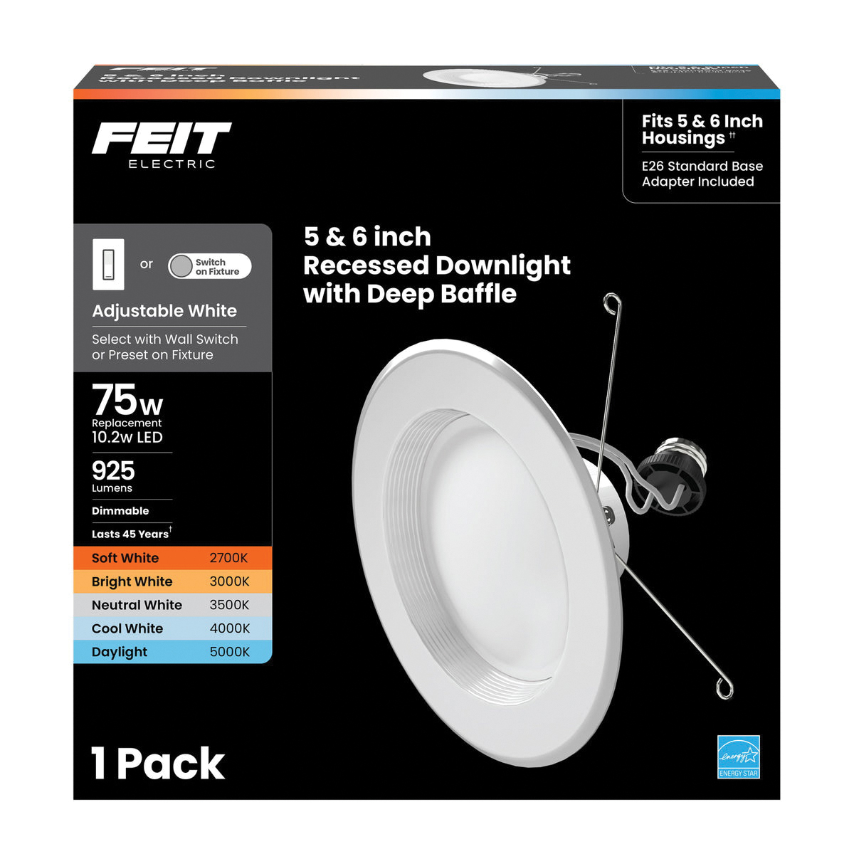 Upgrade older recessed lighting to energy saving LED with enhance LED recessed downlights from Feit Electric. These dimmable adjustable white lights fit most 5 and 6 in housings. Each kit comes with a standard base adapter and a pre-mounted trim for fast, easy replacement of recessed bulbs. Adjustable White color lets you preset your preferred color temperature using a toggle on the fixture or switch anytime from a wall switch. Match your current lighting or get the ideal light in every room for every mood. Enhance® 90+ CRI LED provides our highest-quality light, for the most vibrant colors and natural skin tones. They produce up-to 925 lumens using only 10.2 W up-to 87% less energy than an equivalent 75 W incandescent light. A baffle trim design adds extra softness and a comforting glow to the light. Choose a dependable LED fixture that looks great while saving on energy costs and lasting decades.