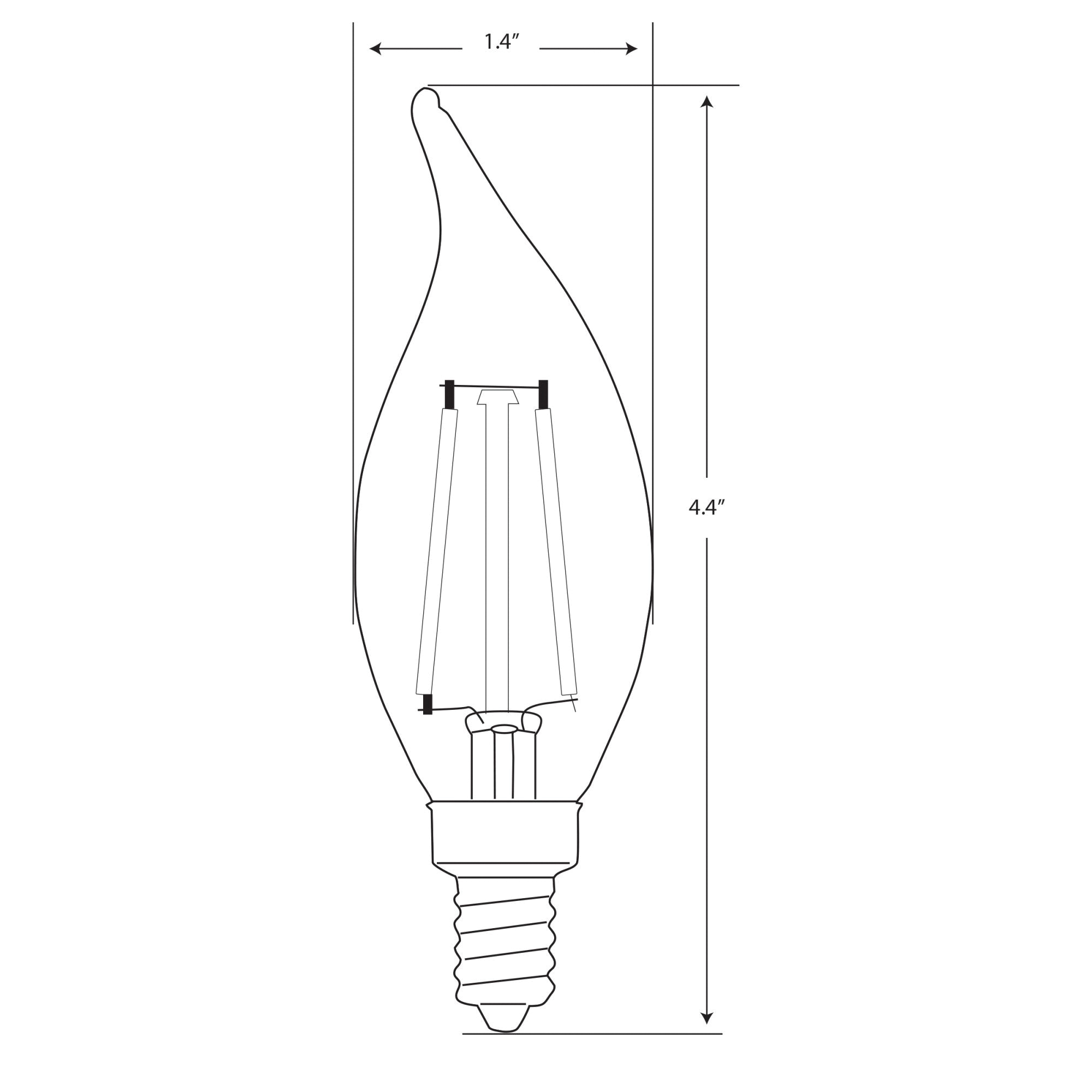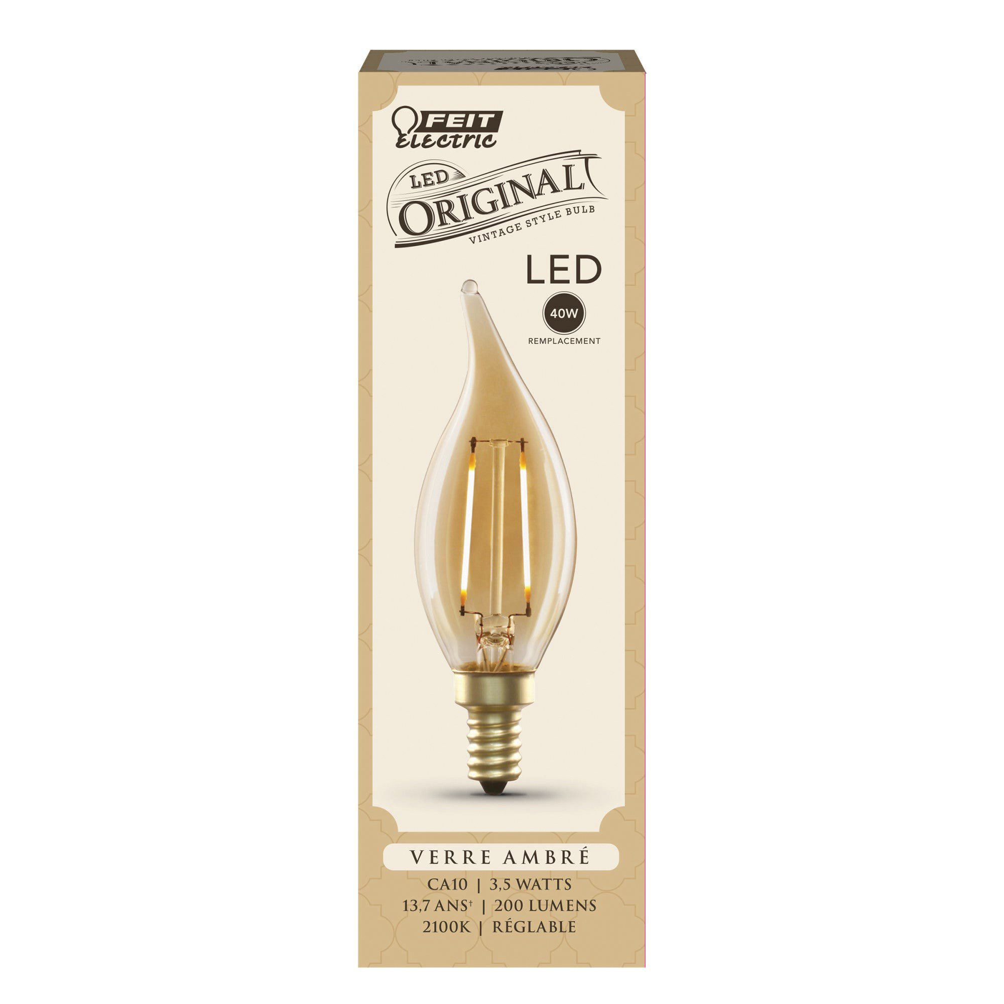 Combine the traditional look of chandelier lighting with the advantages of modern LED technology with this Vintage LED light bulb. This 2100 K soft white light is dimmable and replaces 40 W incandescent bulbs while using just 3.5 W of electricity - saving up to 91% in energy costs. A stylish flame tip look with an exposed filament encased in amber glass is ideal for decorative lighting fixtures like chandeliers and wall sconces. They emit 200 Lumens each, for an inviting decorative glow. Enhance the decor of any room with CFT/VG/LED flame tip LED bulbs.
