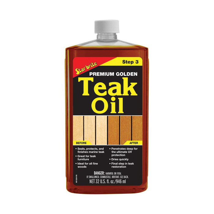 Star briteĀ® premium golden teak oil is the finest sealer/preserver/finish for marine teak and other fine woods. Star briteĀ® uses premium natural oils that are ultra-refined and chemically modified to form high molecular weight polymers that withstand long-term exposure to salt water and harsh weather. Special high-technology additives are blended in to protect the wood from the sun's damaging UV rays. The result is the ultimate treatment for maximum protection and beauty of teak surfaces. Ideal for use on all fine woods and wood furniture.