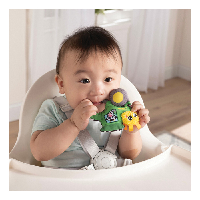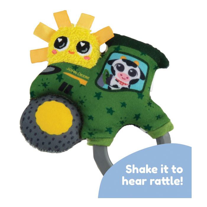 The lamaze my first tractor rattle brings John Deere fun and early learning to baby's playtime. This adorable rattle makes a jingle that delights baby when shaken and helps with auditory development. A happy cow drives this John Deere tractor which features bright colors on one side and a contrasting pattern on the back to provide your baby with visual stimulation during play time. To help promote fine motor skills, the sun's ribbons and the various textured fabrics of the rattle give baby different tactile experiences. The handle also features an interesting texture that encourages your baby to grab hold. My first tractor rattle is not only the ideal size for tiny hands but also easy to pop into the diaper bag for farming fun wherever you go.